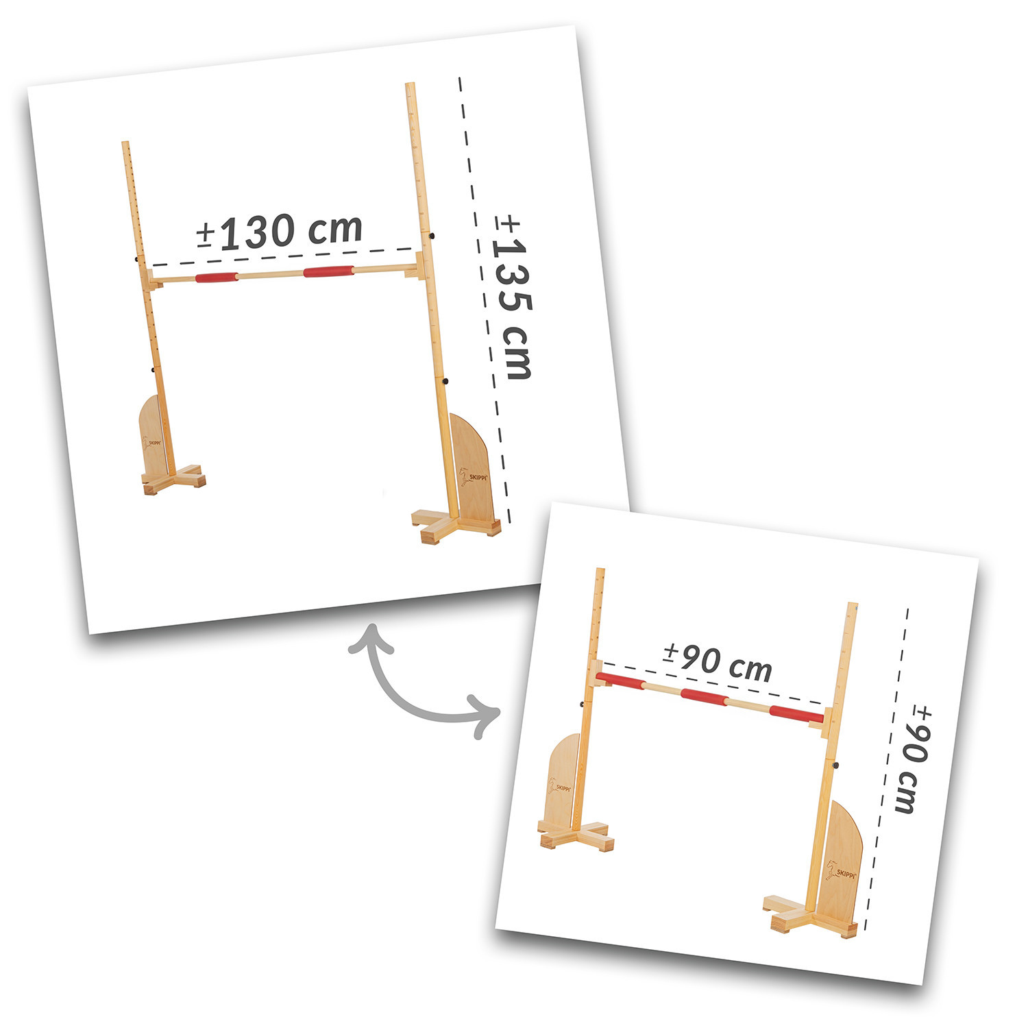 Przeszkoda posiada nadrukowaną miarkę i płynną regulację wysokości, co ułatwia treningi i zabawę. Drewniana podstawa i konstrukcja są solidne i stabilne, a poprzeczka została zaprojektowana tak, by bezpiecznie spadać przy lekkim uderzeniu. Dołączone piankowe osłony chronią dziecko podczas zabawy.