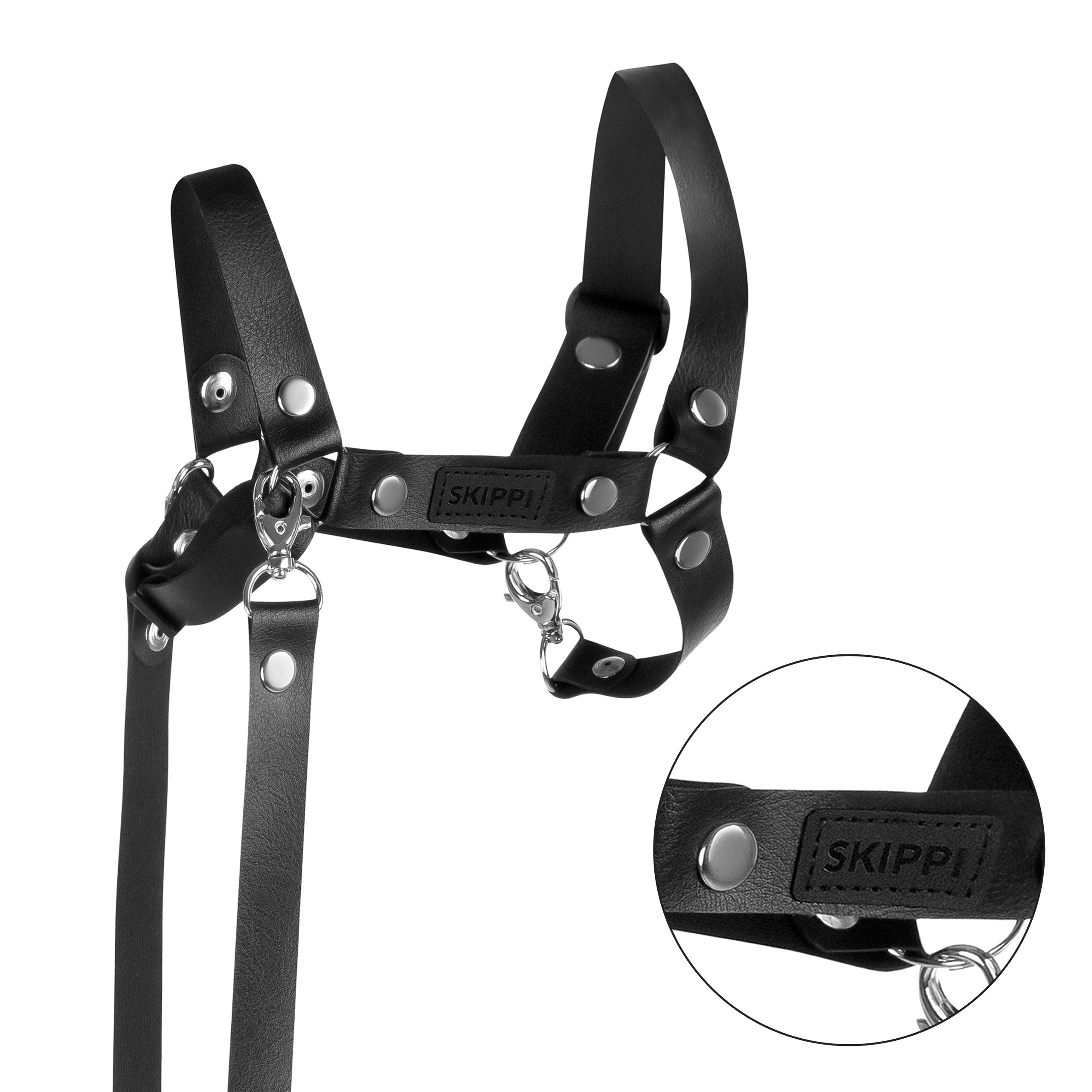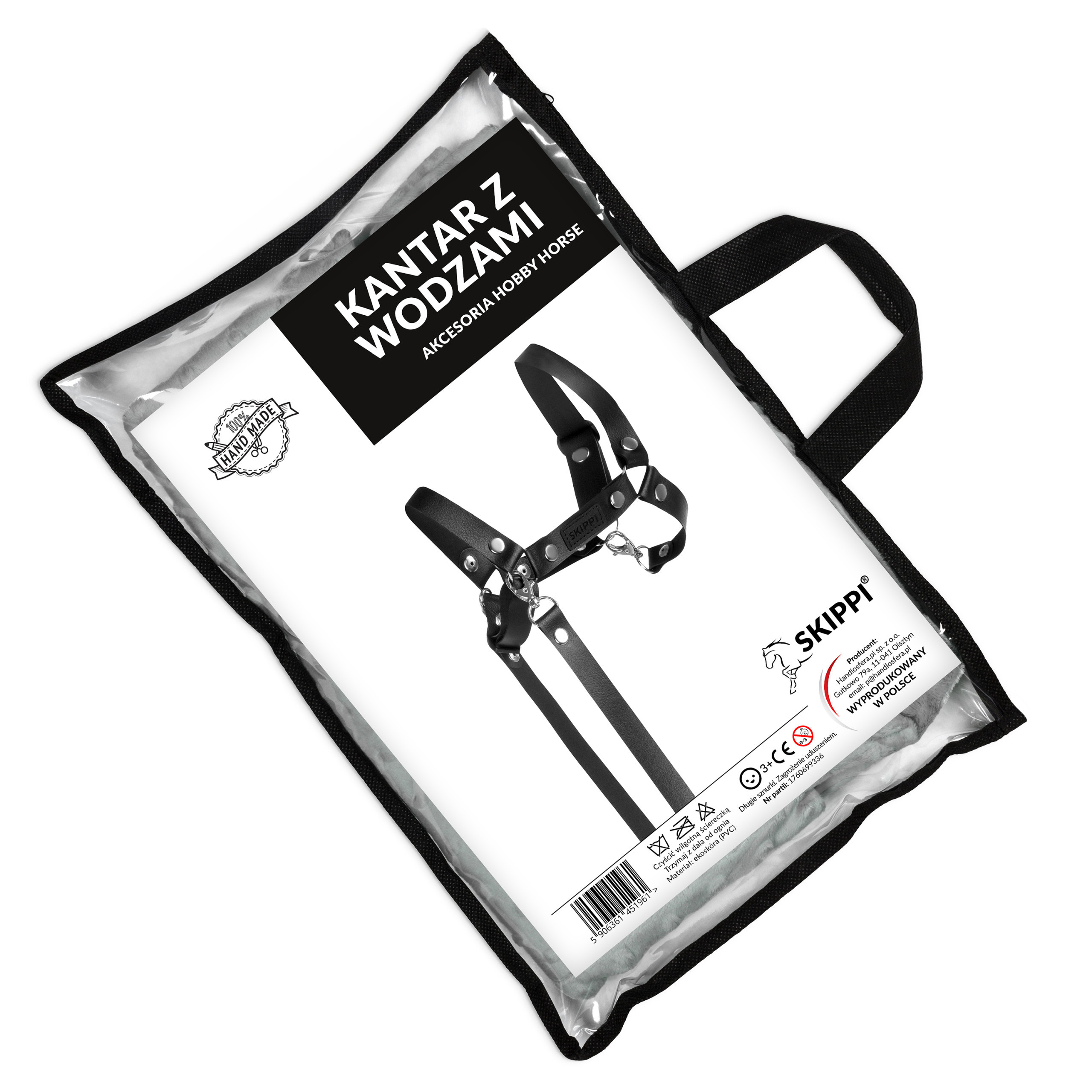 Kantar z wodzami Skippi w eleganckim kolorze czarnym to stylowy, trwały i funkcjonalny zestaw dla każdego miłośnika Hobby Horse. Wykonany z wysokiej jakości ekoskóry (PVC) i ozdobiony metalowymi ćwiekami, wygląda jak prawdziwy sprzęt jeździecki w miniaturowej wersji.