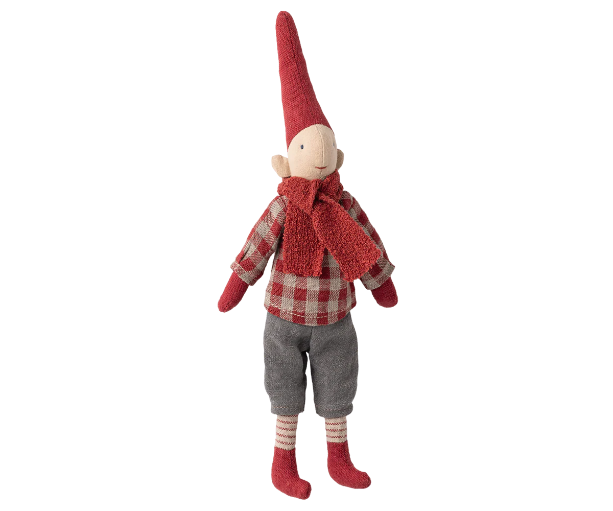 Ten krasnoludek Pixy Maileg w czerwonej koszuli w kratę to pełen uroku mały pomocnik Świąt Bożego Narodzenia. Jego łagodny uśmiech, długa czapeczka i klasyczny strój w stylu nordyckim przywołują wspomnienia rodzinnych, spokojnych Świąt spędzanych przy blasku świec i zapachu pierników.