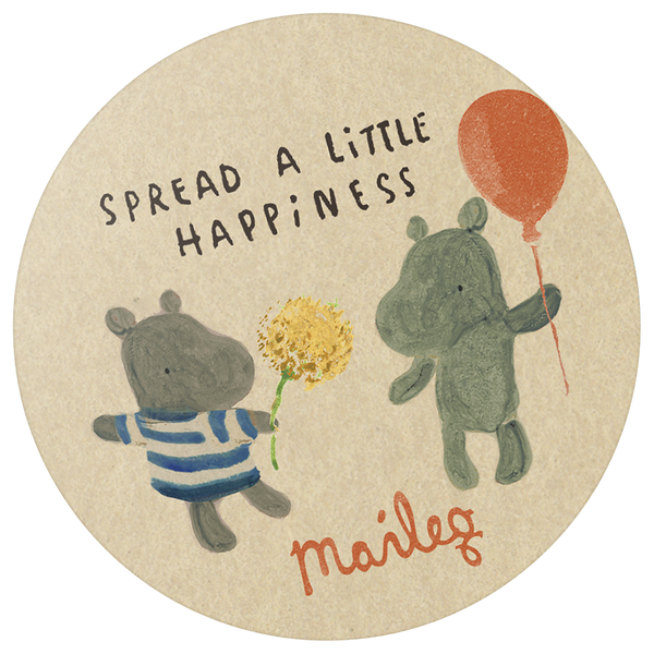 Okrągła papierowa naklejka Maileg z logo marki i hasłem „Podziel się odrobiną szczęścia” to prosty, a bardzo efektowny sposób na estetyczne domknięcie pakowania. Możesz używać jej na prezentach, kartkach oraz paczkach e-commerce – wszędzie tam, gdzie liczy się mały detal i spójny styl.