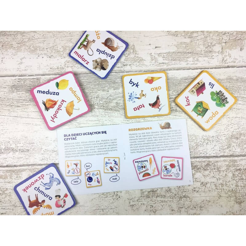 - Liczba kart: 105 kart z kolorowymi ilustracjami + karty słowniczka obrazkowego