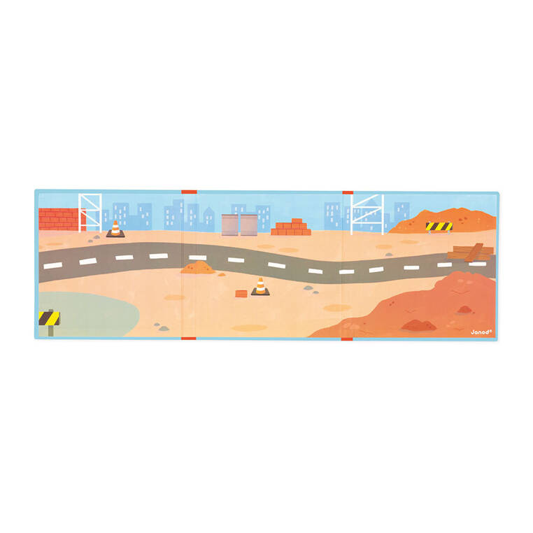 „Plac budowy” z serii Magneti’stories to zestaw dla dzieci, które fascynują się maszynami, sprzętem i tym, jak powstają budynki. Na rozkładanej, potrójnej planszy magnetycznej można układać elementy związane z budową i tworzyć własne scenariusze – od ustawiania oznaczeń po „organizowanie” pracy ekipy.