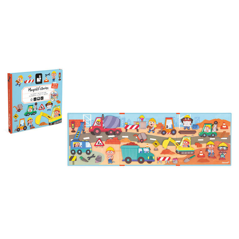 Magneti’stories „Plac budowy” Janod to magnetyczna układanka z rozkładaną potrójną planszą i 31 elementami do tworzenia budowlanych scenek. Dla dzieci 3+ – pozwala układać własne historie z pojazdami i ekipą budowlaną, wspierając kreatywność i małą motorykę.
