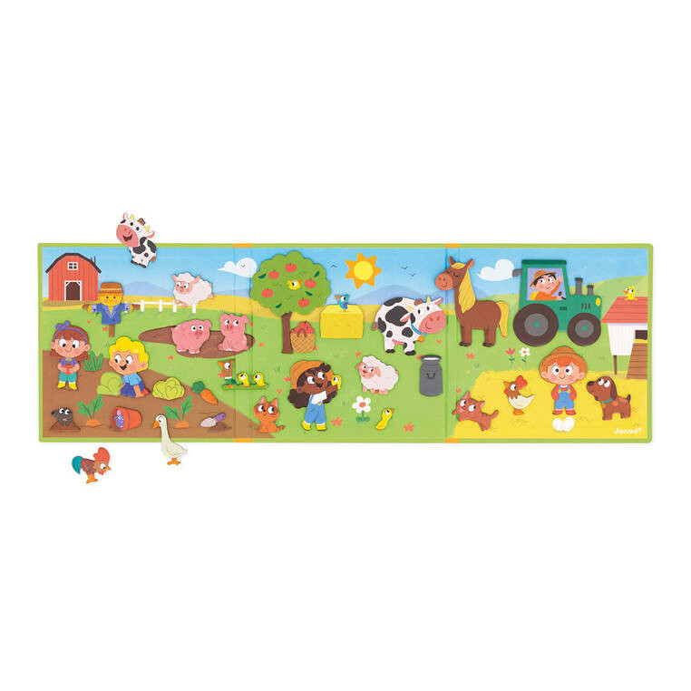 Magnetyczna układanka Farma z serii Magneti’stories marki Janod przenosi dziecko na tętniące życiem gospodarstwo. W zestawie znajduje się 30 magnesów: zwierzęta gospodarskie, rolnicy i ogrodnicy, dzieci, rośliny oraz elementy wiejskej scenerii. Wszystkie części można dowolnie łączyć na rozkładanej, potrójnej planszy, tworząc własne opowieści o codzienności na farmie.