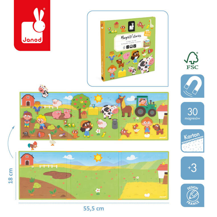 Opakowanie wykonane jest ze sztywnego kartonu FSC w formie książki. Po rozłożeniu okładka zamienia się w trzyczęściową planszę magnetyczną, na której dziecko tworzy własną „farmę marzeń”. Po skończonej zabawie wszystkie elementy wracają na swoje miejsce, dzięki czemu łatwiej utrzymać porządek w pokoju. Estetyczne ilustracje i wysoka jakość wykonania są charakterystyczne dla francuskiej marki Janod.