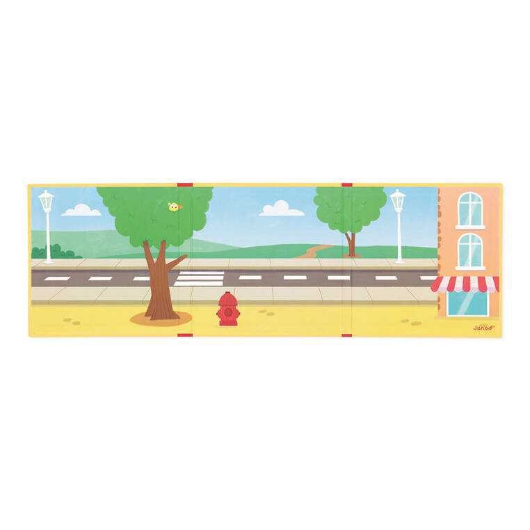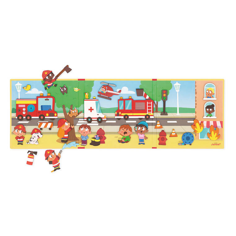 Magnetyczna układanka Strażacy Janod Magneti’stories – 30 magnesów z wozem strażackim, ratownikami i zwierzakami oraz rozkładana plansza w formie książki do tworzenia własnych akcji ratunkowych.