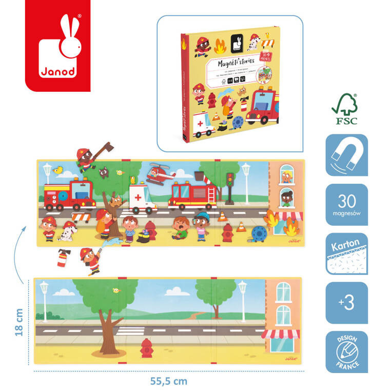 Magnetyczna układanka Strażacy z serii Magneti’stories Janod przenosi dziecko w sam środek strażackiej akcji. W zestawie znajdziesz 30 magnesów – strażaków, pojazdy, płomienie, zwierzęta i wyposażenie ratownicze – oraz rozkładaną, potrójną planszę w formie książki. Twoje dziecko może dowolnie układać elementy, wymyślając własne historie o bohaterskich strażakach w akcji.