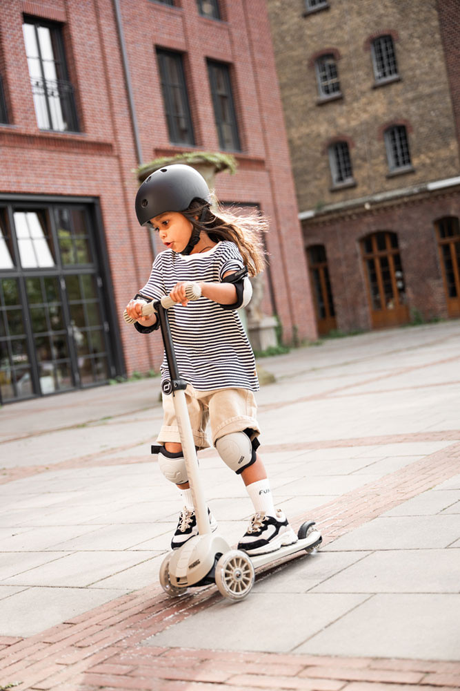 Highwaykick 3S można złożyć w dwóch prostych krokach, dlatego łatwiej przechowywać ją w domu i przewozić w aucie. Kierownica jest regulowana w 4 stopniach, co pozwala lepiej dopasować hulajnogę do wzrostu dziecka. Producent zastosował także lekką aluminiową rączkę z uchwytami ograniczającymi ześlizgiwanie się dłoni. Z perspektywy codziennego użytkowania znaczenie ma również antypoślizgowy podest, który wspiera stabilne ustawienie stopy, oraz przycisk umożliwiający wyjęcie kierownicy.
