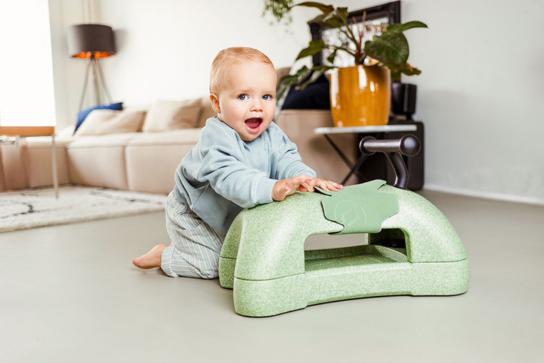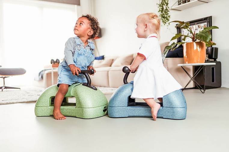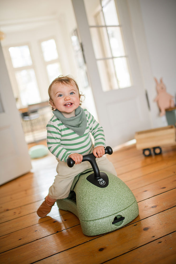 Po odwróceniu podstawy na stronę z kółkami My First staje się jeździkiem. Dziecko może usiąść i poruszać się, odpychając się nogami od podłogi. To etap, który wspiera naukę równowagi, rozwój koordynacji oraz większą świadomość pracy własnego ciała. Ciche, nisko osadzone koła i przednie kółka obracające się o 360 stopni dają swobodę manewrowania w pomieszczeniach. Producent podkreśla też, że konstrukcja jest przyjazna dla domowych powierzchni, więc model dobrze nadaje się do codziennej zabawy w domu.