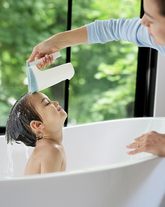 Ergonomiczny uchwyt pozwala rodzicom na pewne i wygodne trzymanie kubka podczas płukania włosów.