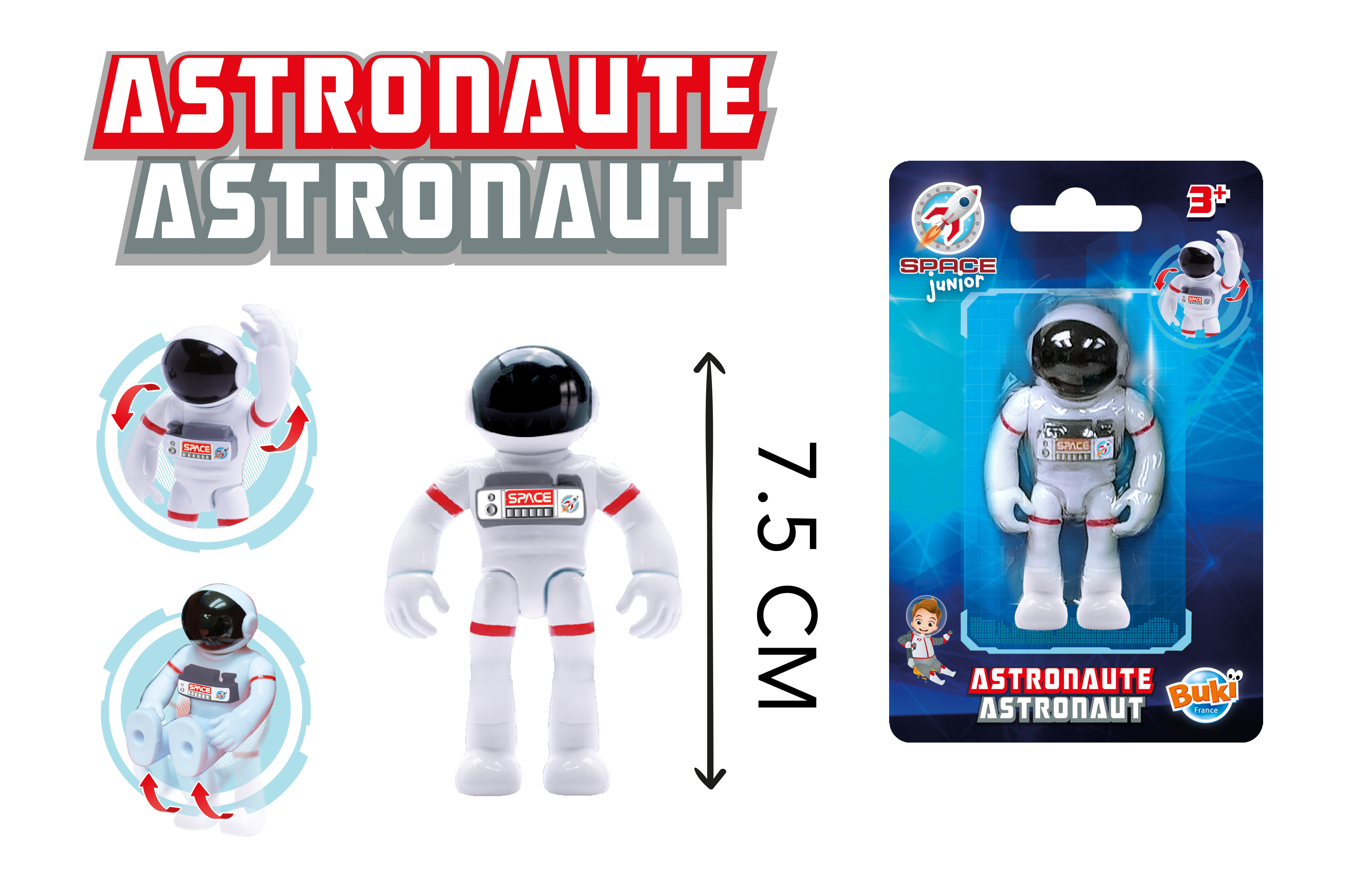 Figurka astronauty BUKI Space Junior (7,5 cm) z ruchomymi ramionami i nogami – idealny towarzysz kosmicznych zabaw, kompatybilny z całą serią Space Junior.