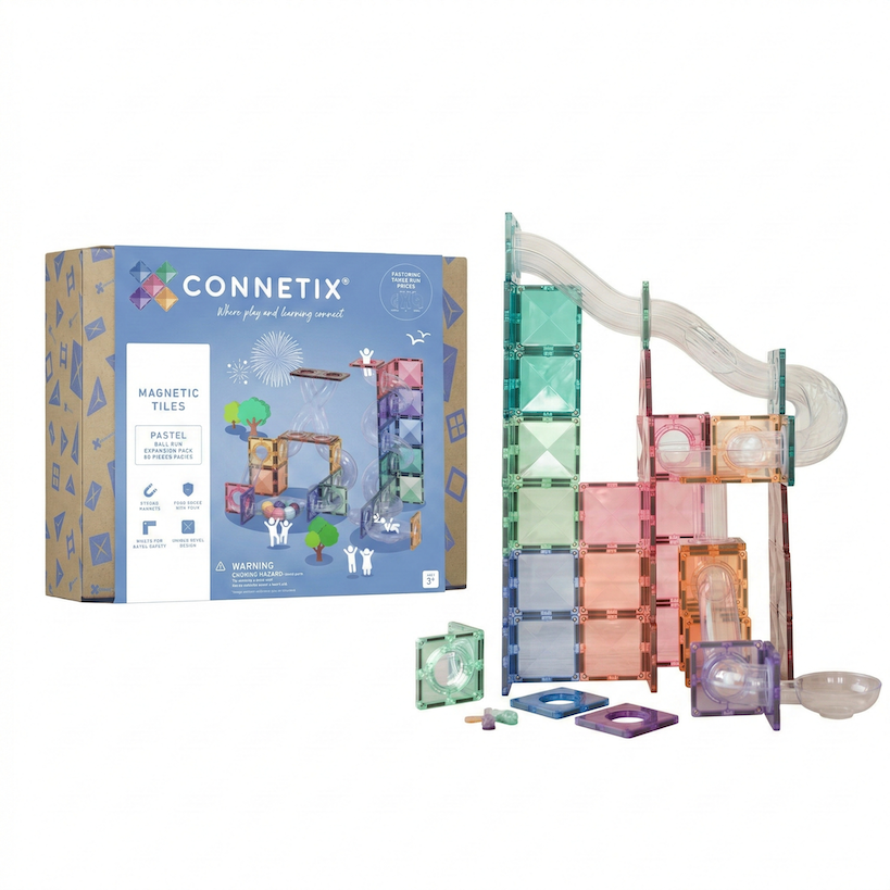 Pastelowy zestaw rozszerzający kulodrom Connetix pozwala budować większe trasy i dłużej utrzymać zainteresowanie dziecka zabawą klockami magnetycznymi. Zawiera 80 elementów, w tym rurki, łączniki, misy i drewniane kulki do eksperymentów z ruchem oraz grawitacją.