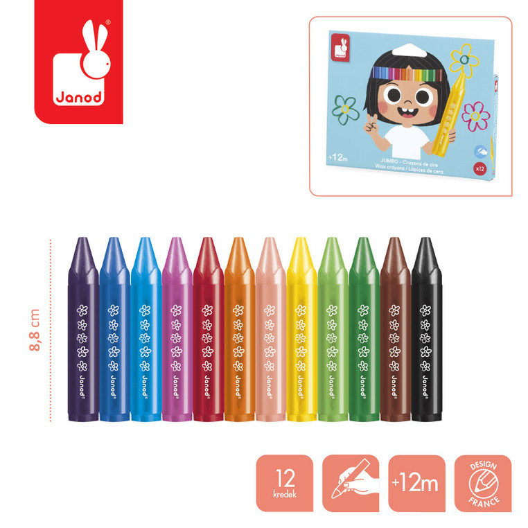 Kredki Woskowe - 12 Kolorów - Jumbo Świecowe Łatwy Chwyt - od 12 miesięcy - Janod