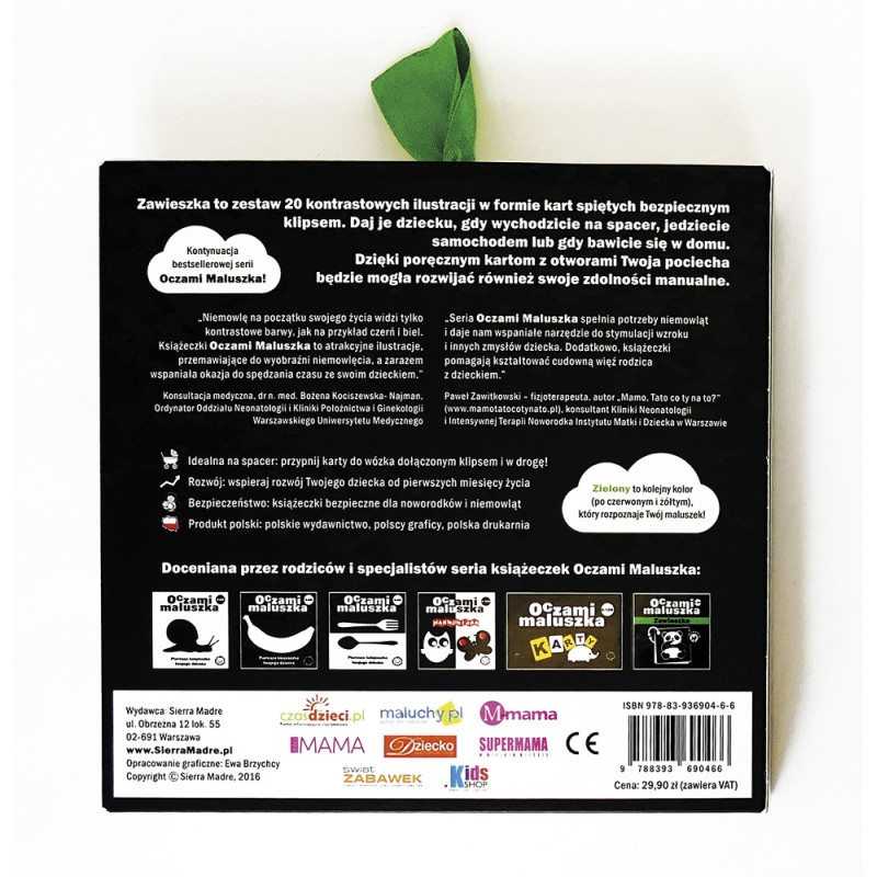 Oczami Maluszka: Zawieszka to najnowsza część kultowej, polskiej serii kontrastowych książeczek i kart dla niemowląt, opracowanej przez specjalistów z zakresu neonatologii i fizjoterapii. Ten zestaw 20 kart z bezpiecznym klipsem stworzono z myślą o wspieraniu rozwoju wzroku i zmysłów dziecka już od pierwszych tygodni życia.