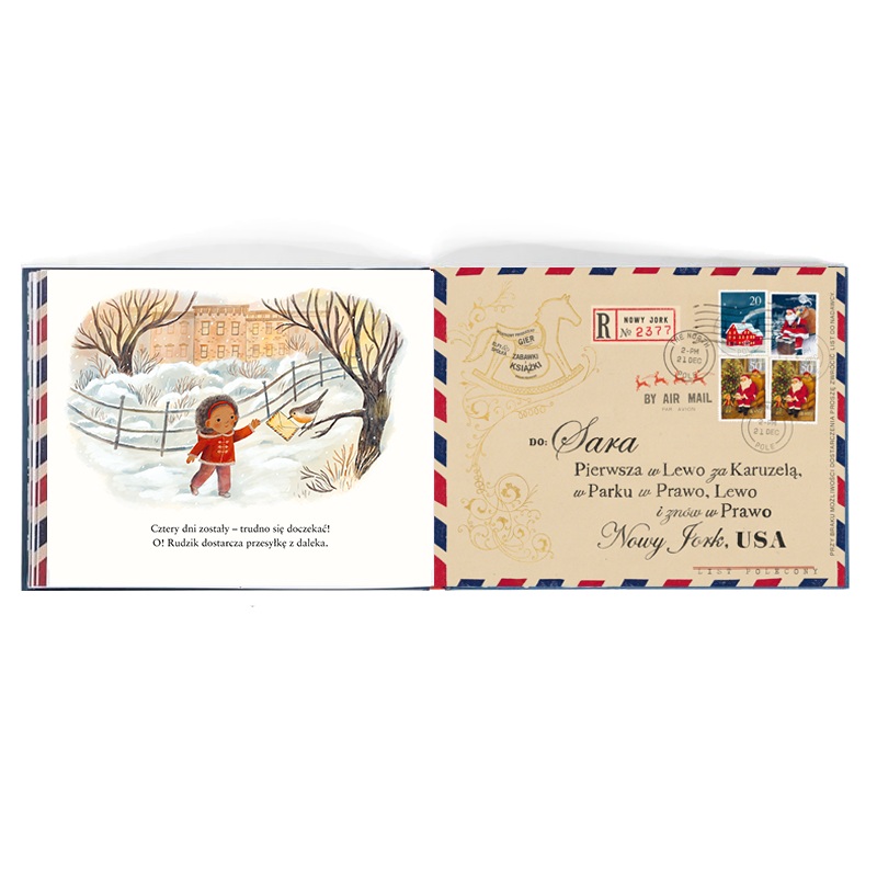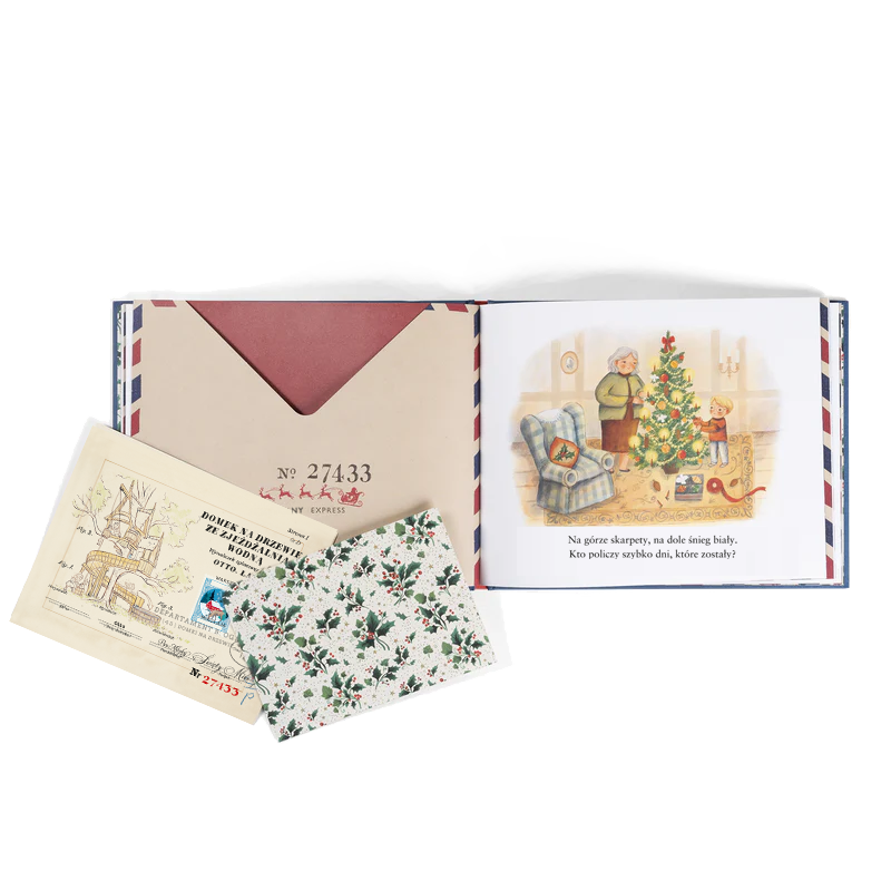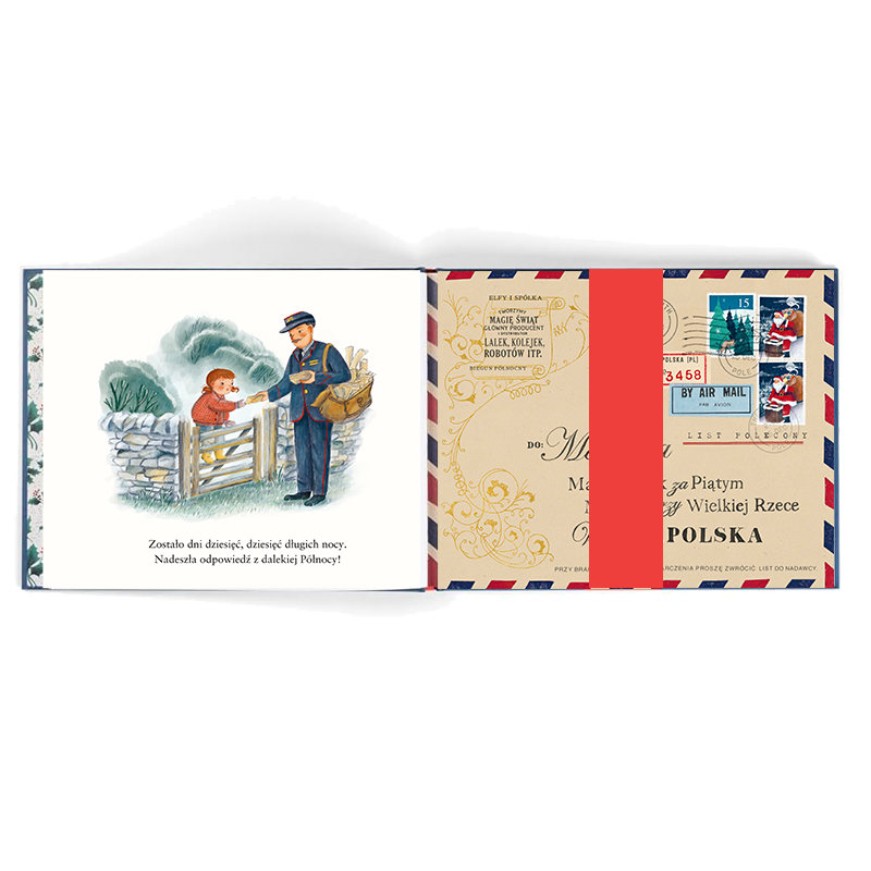 Wizualna warstwa książki to prawdziwe dzieło sztuki. Annie Atkins, znana z projektowania filmowych rekwizytów, stworzyła realistyczne koperty, stemple i papier firmowy z Bieguna Północnego, nadając książce wyjątkowy charakter retro. Ilustracje autorstwa Fii Tobing utrzymane są w klasycznej, świątecznej palecie kolorów z akcentami złota i czerwieni, co nadaje całości ponadczasowego uroku.
