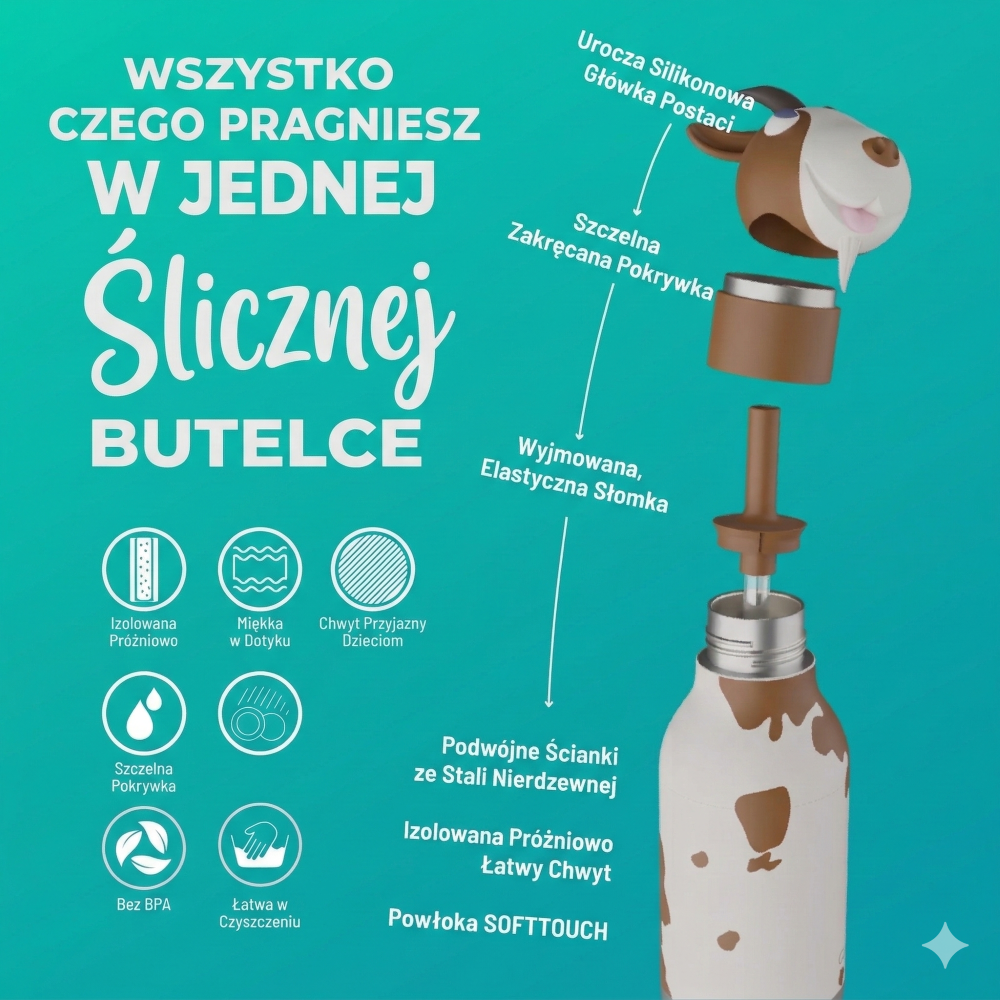 To butelka, która dobrze sprawdza się nie tylko u dzieci. Silikonowa główka zwierzątka jest zdejmowaną nakładką na zakrętkę, więc w razie potrzeby można ją łatwo zdjąć i korzystać z bardziej neutralnej wersji butelki. Dzięki temu model pasuje także nastolatkom i dorosłym, którzy chcą zachować funkcjonalność Bestie Bottle, ale wolą spokojniejszy, bardziej uniwersalny wygląd na co dzień.