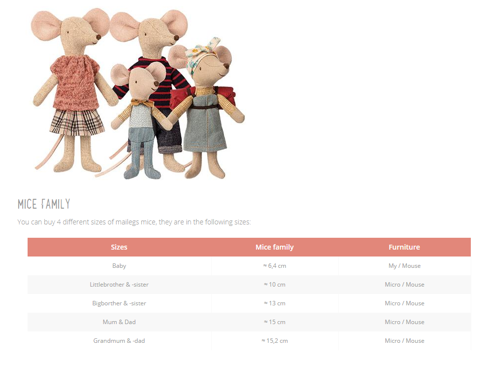 Myszki Maileg to najbardziej rozpoznawalny z produktów duńskiej marki. Dostępne w różnych wersjach, zawsze jednakowo dobrze bawią, rozczulają, uczą kontaktu z pięknem i prostotą. Gorąco polecamy i zapraszamy do skompletowania własnej kolekcji Maileg!