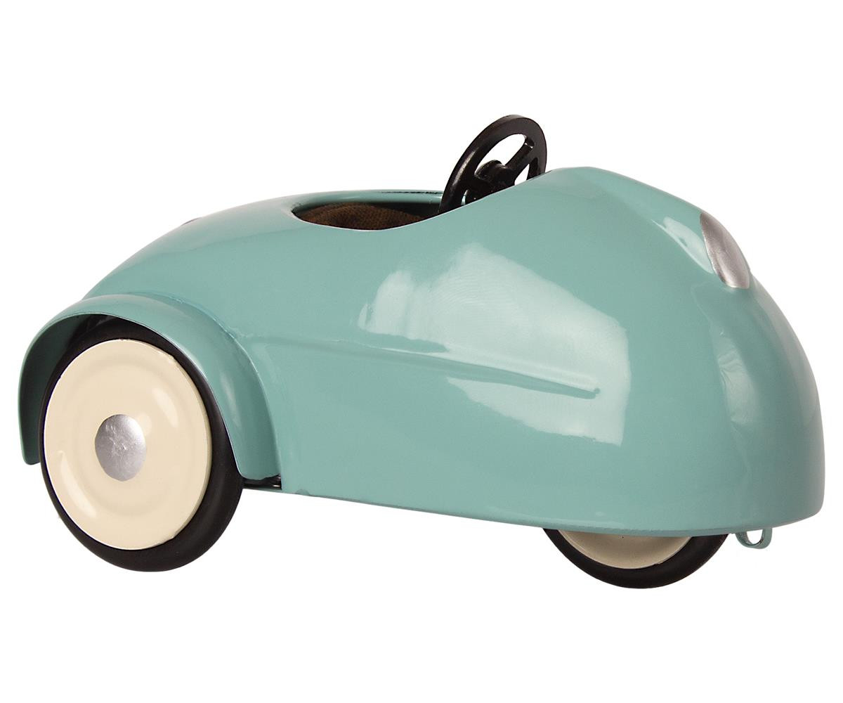 - błękitne autko, ze skórzanym fotelem i gumowymi oponami