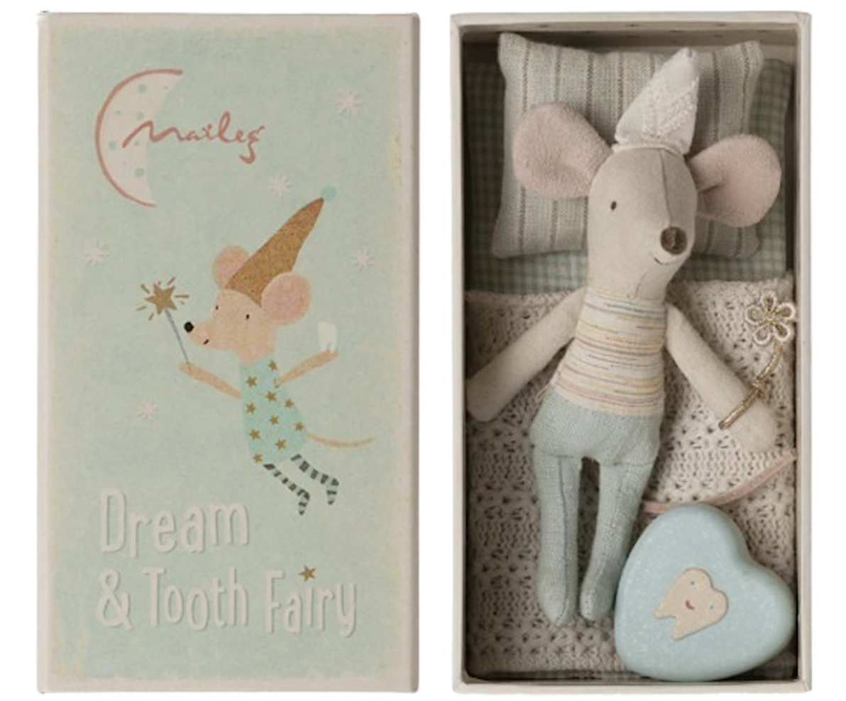 Myszka Zębuszka z kolekcji Little Brother ubrana w magiczną, białą czapeczkę przyszytą na stałe do myszki oraz ściąganą różdżkę wykończoną złotą nitką i małym kwiatem na czubku. Materiał, z którego wykonano myszkę jest w kolorze złamanej bieli, tułów ozdobiono kolorowymi paskami, a dolne kończyny jasnym, niebieskim materiałem. Zabawka posiada naszyte elementy twarzy oraz duże, sterczące uszy wykończone różowym, miłym w dotyku materiałem. Z tyłu znajduje się długi ogon.