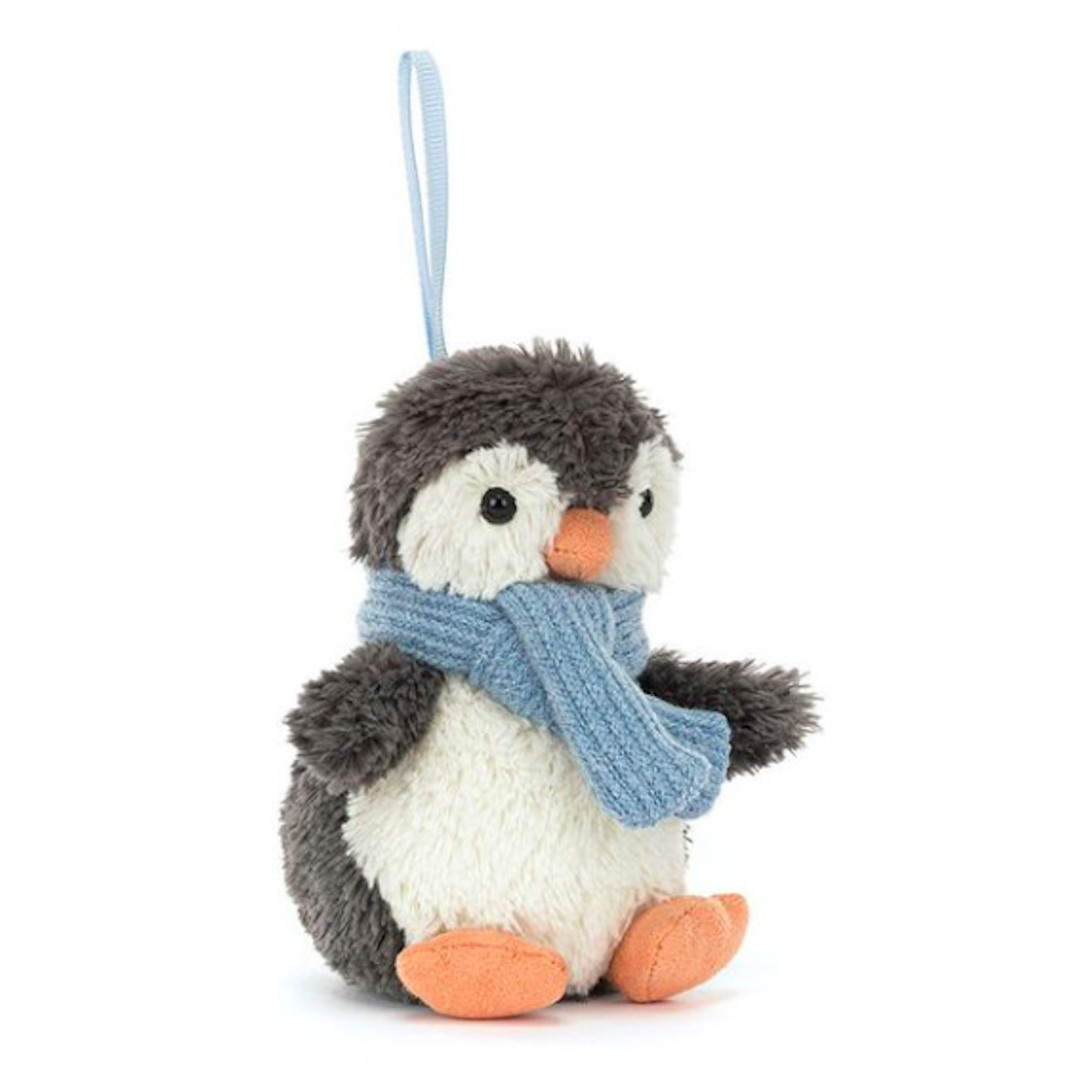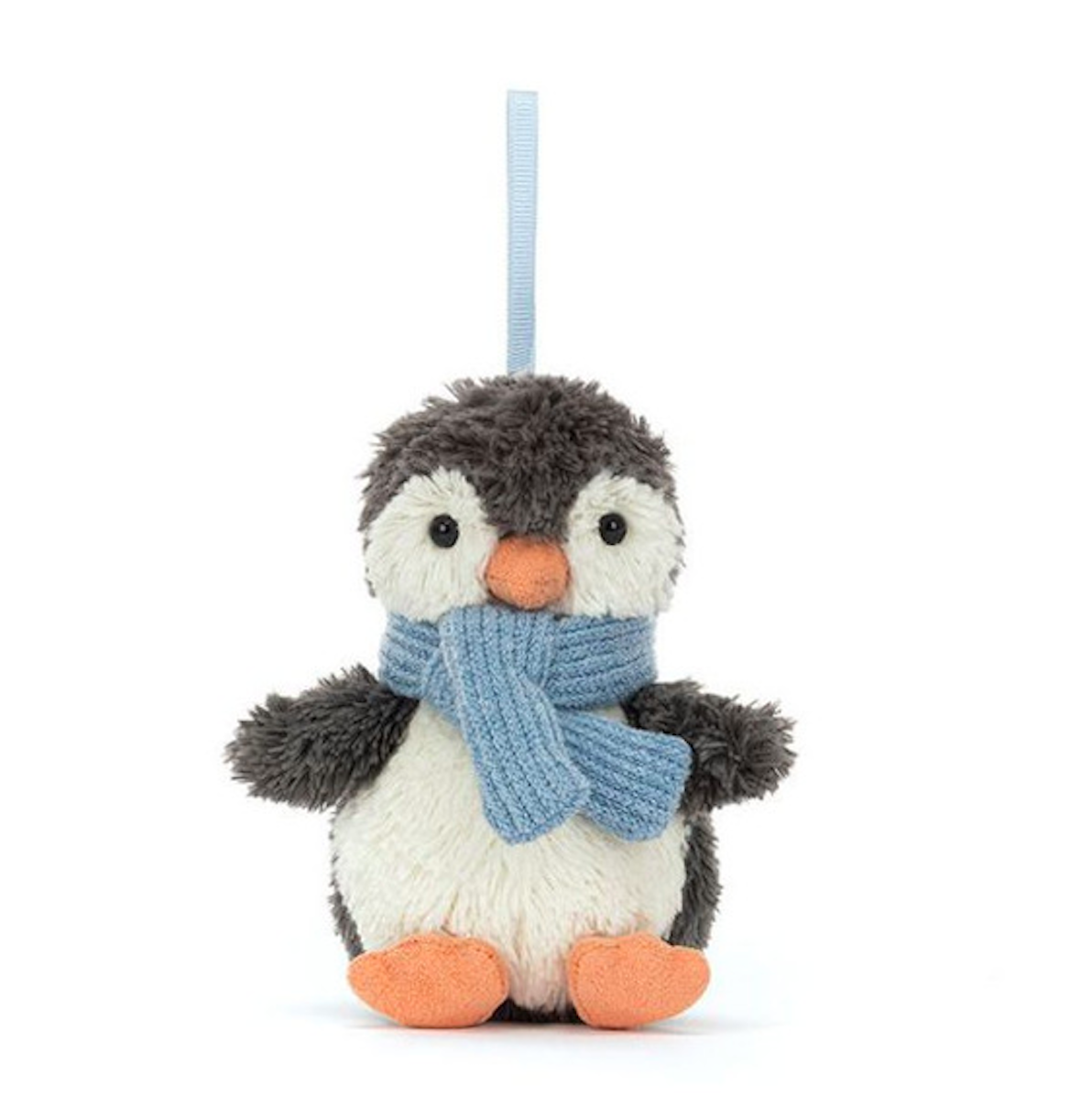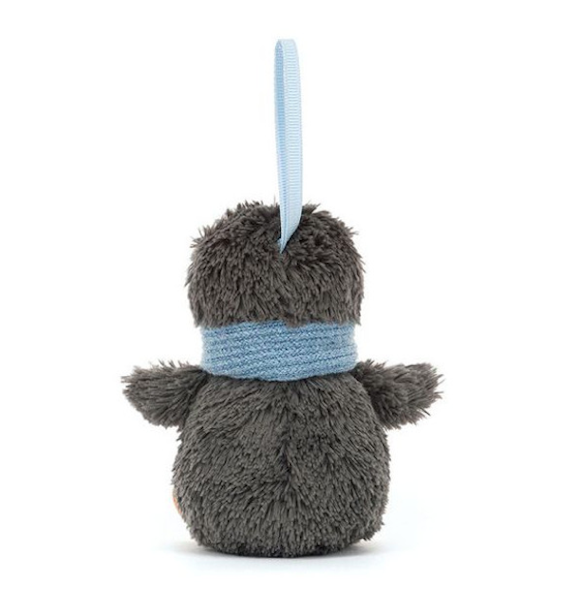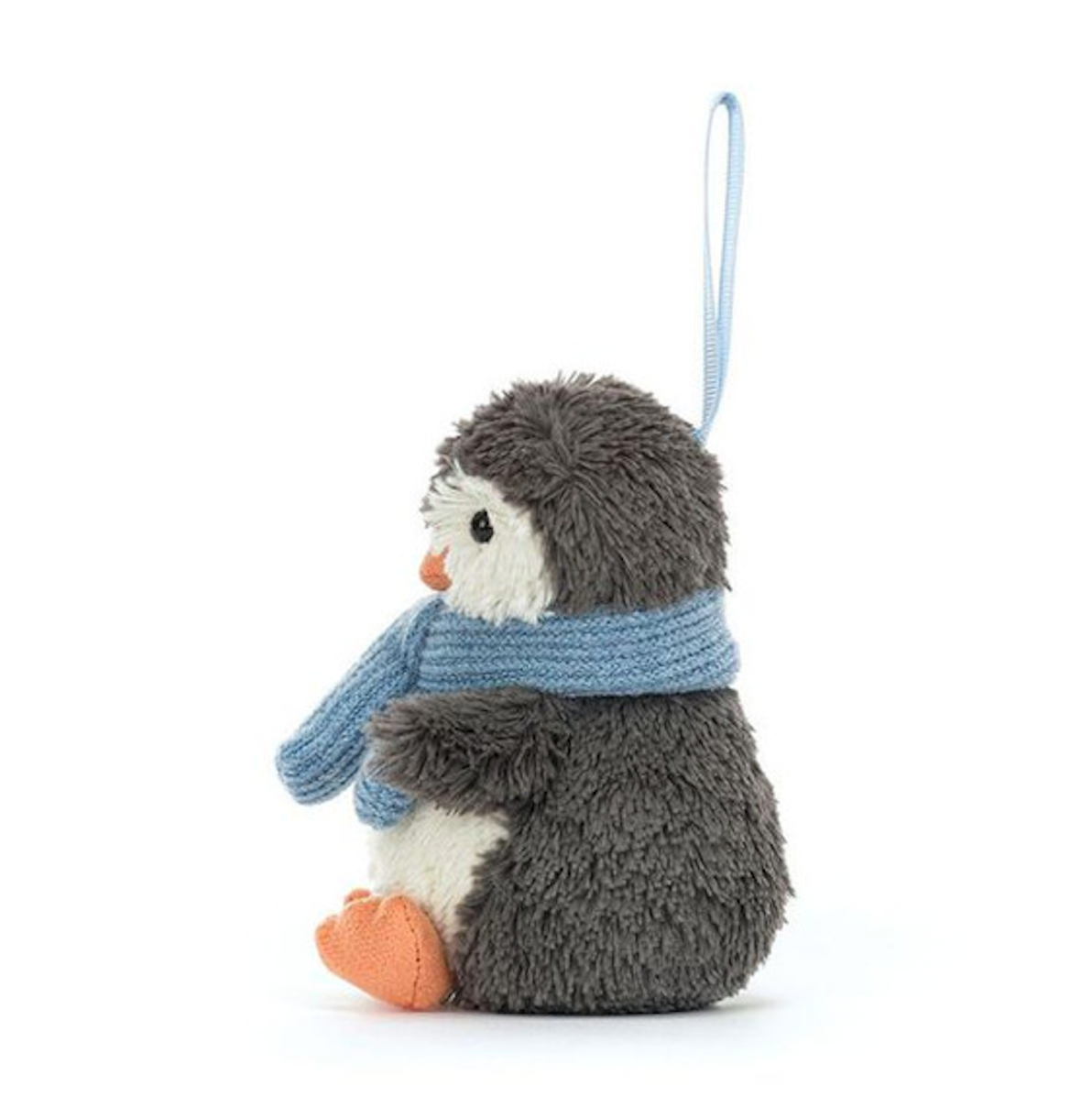 Ten uroczy pingwinek nosi niebieski sztruksowy szalik i ma kędzierzawe, niebiesko-szare futerko, waniliowy brzuszek oraz słodki wyraz pyszczka. Jego pomarańczowy zamszowy dzióbek i płetwy dodają mu jeszcze więcej uroku. Idealnie nadaje się do zawieszenia na świątecznej choince, ale także do zabawy i przytulania, co czyni go doskonałym prezentem na święta. Pluszak został uszyty z najwyższej jakości, trwałych i bezpiecznych materiałów.