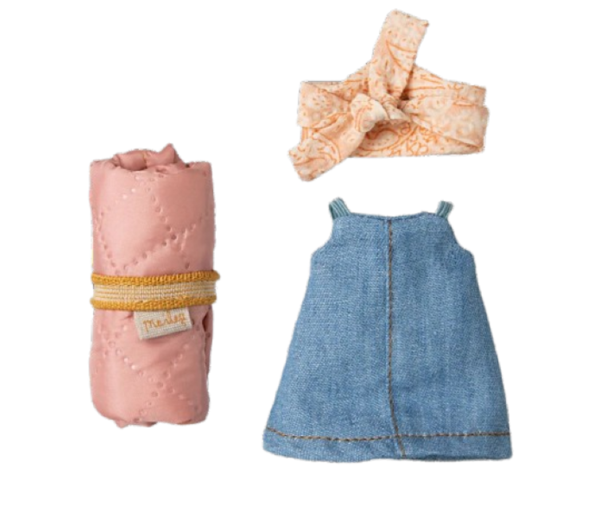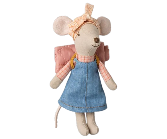 Myszka Wędrowiec Big Sister od Maileg – gotowa na przygody! Ubrana w stylowy strój podróżnika ze śpiworem. Idealna dla małych odkrywców!