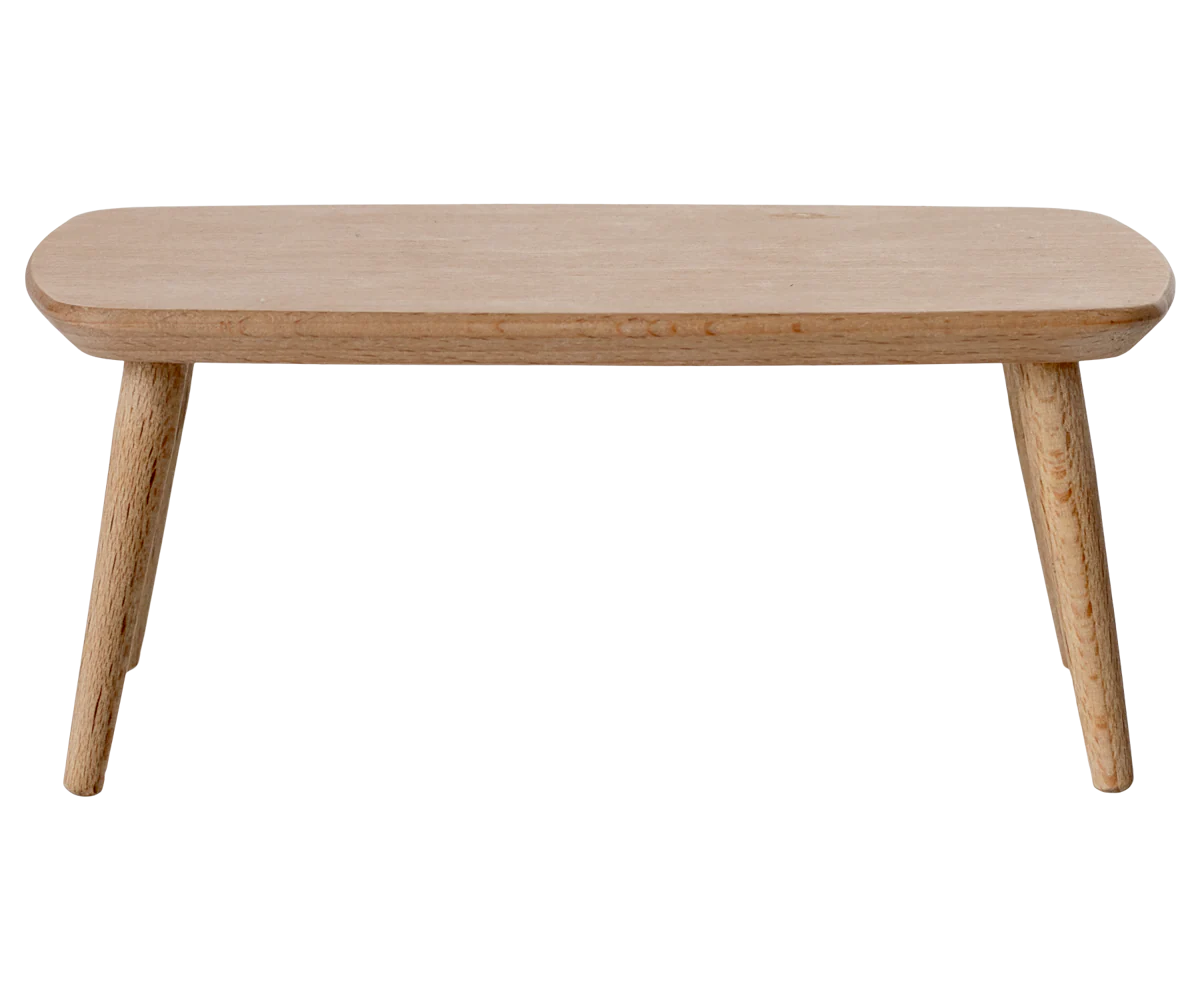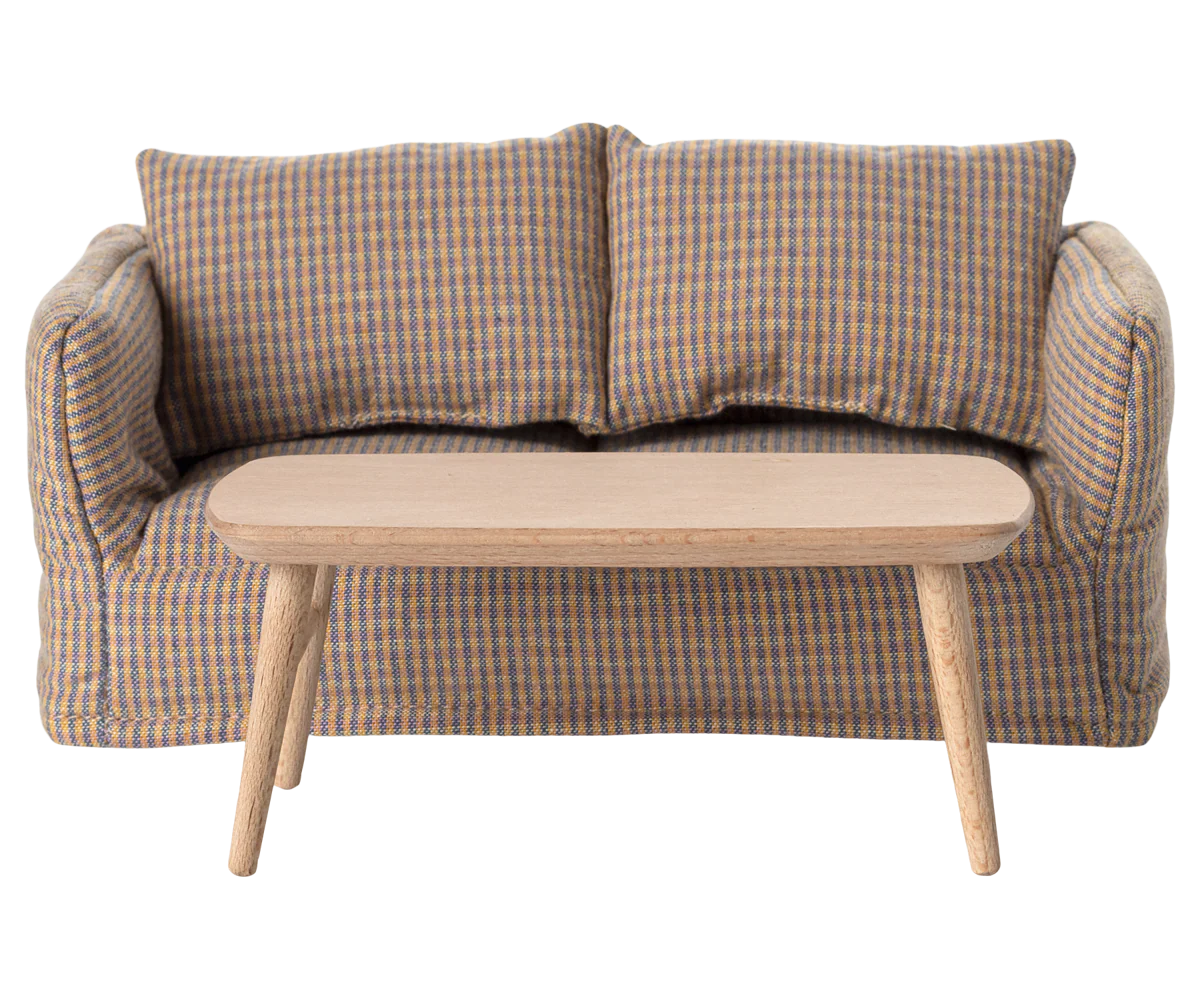 Prostokątny drewniany stolik kawowy Maileg w naturalnym kolorze. Idealny dla myszek – pasuje do domków i sof z kolekcji Maileg.