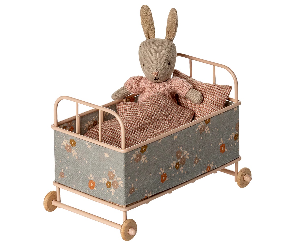 Metalowe łóżeczko dziecięce Maileg w kolorze pudrowego różu. W zestawie materac, poduszka i kocyk. Idealne dla myszek i przyjaciół w rozmiarze Micro.