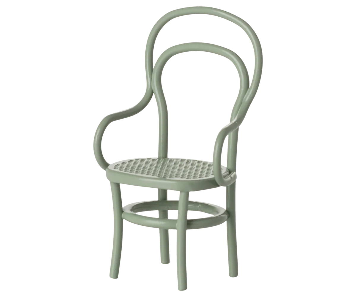 Metalowe krzesło Maileg w kolorze mięty. Pasuje do myszek Little Brother/Sister i Big Brother/Sister. Styl vintage – piękny dodatek do domków i zamków Maileg.