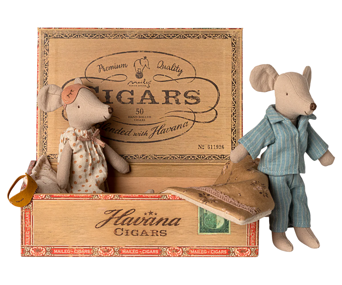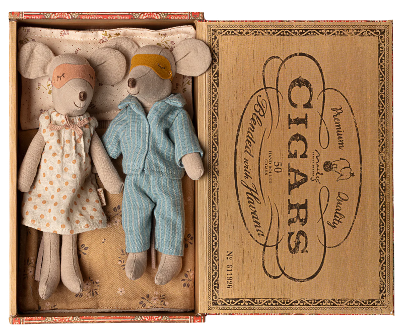 closeKlasyczny zestaw Maileg – Mama i Tata Myszka w piżamkach i maskach na oczy. Pudełko po cygarach pełni rolę łóżka z pościelą.