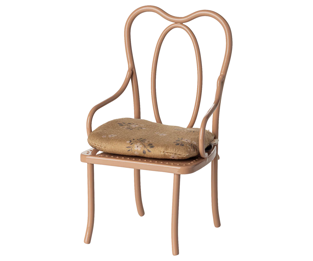 Vintage Chair, Mini – Dark Powder to stylowe krzesło Maileg w kolorze pudrowego różu, które wprowadzi do świata miniaturek nutę elegancji i komfortu. Wykonane z metalu w odcieniu vintage i wyposażone w miękką, bawełnianą poduszkę, jest doskonałym mebelkiem do odpoczynku dla króliczków i myszek Maileg w rozmiarze 1 i 2.