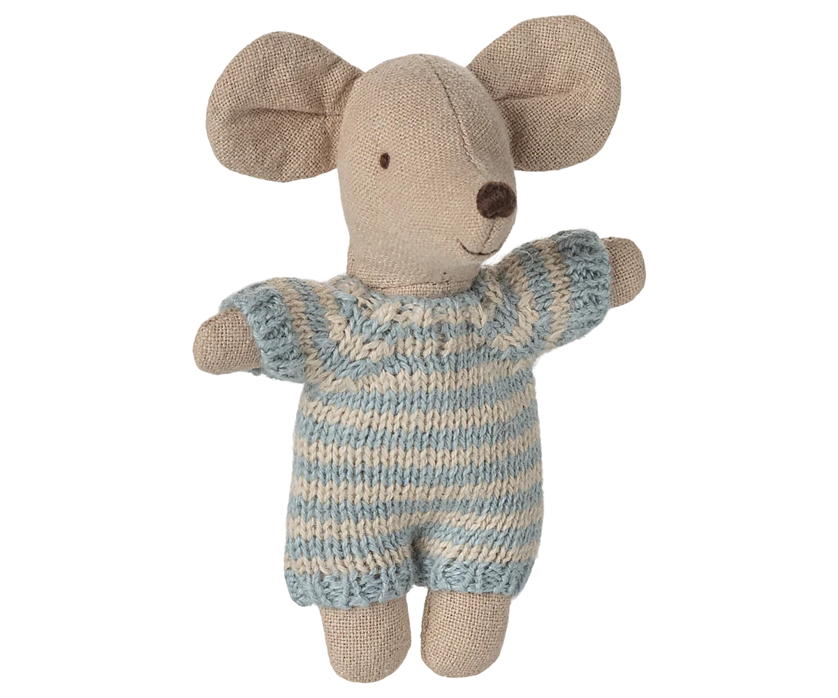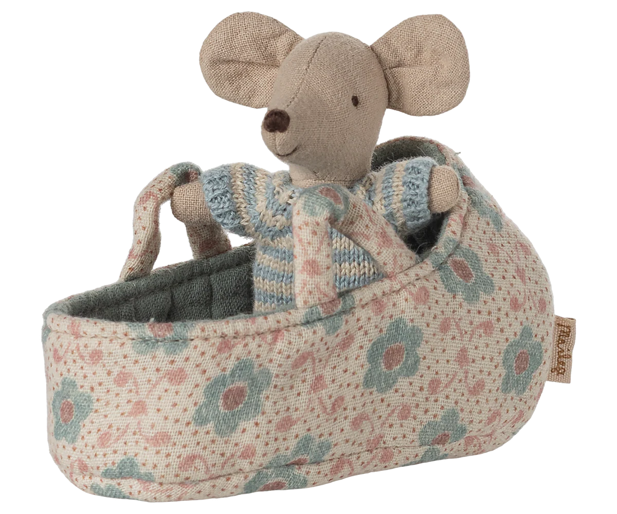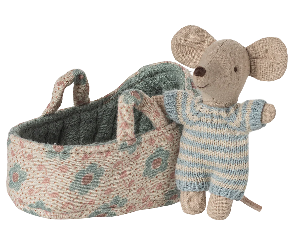 closeMaleńka Myszka Dzidziuś Maileg w niebieskim nosidełku – ubrana w pasiasty pajacyk, gotowa do snu i tulenia. Ręcznie szyta, miękka i pełna uroku – idealna do kolekcji Maileg.