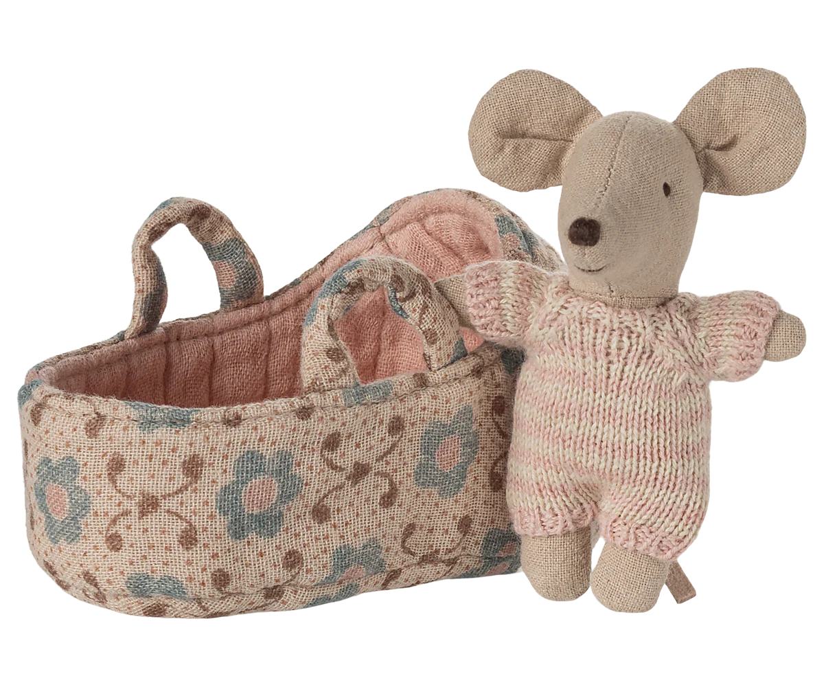 Myszka ma około 6 cm wysokości i jest wykonana z miękkiej bawełny z wypełnieniem z poliestrowych włókien. Jej miniaturowe ubranko w pasy i maleńkie uszka nadają jej wyjątkowego uroku. Nosidełko (carry cot) wykonane jest z tkaniny z pikowanym wnętrzem, które pełni rolę przytulnego łóżeczka. Zestaw zachwyca dbałością o każdy szczegół, dzięki czemu wygląda jak mała, ręcznie robiona pamiątka z dzieciństwa.