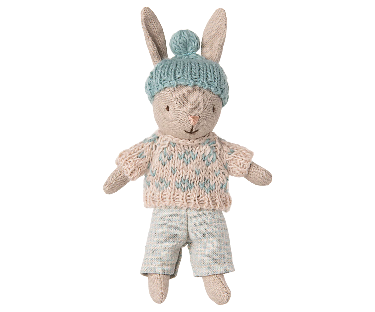 closeUroczy zimowy króliczek Maileg w piaskowym kolorze, ubrany w miękki sweterek i niebieską czapkę. Idealny towarzysz zabaw i dekoracja do świata Maileg – gotowy na zimowe przygody!