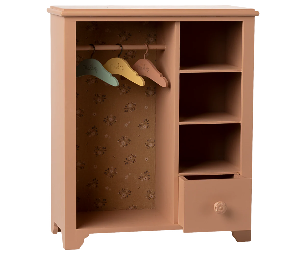 closeUrocza szafa Maileg w odcieniu pudrowego różu – idealna garderoba dla króliczków i misiów. Drewniana, z szufladą i wieszakami, wniesie do zabawy elegancję i skandynawski urok.