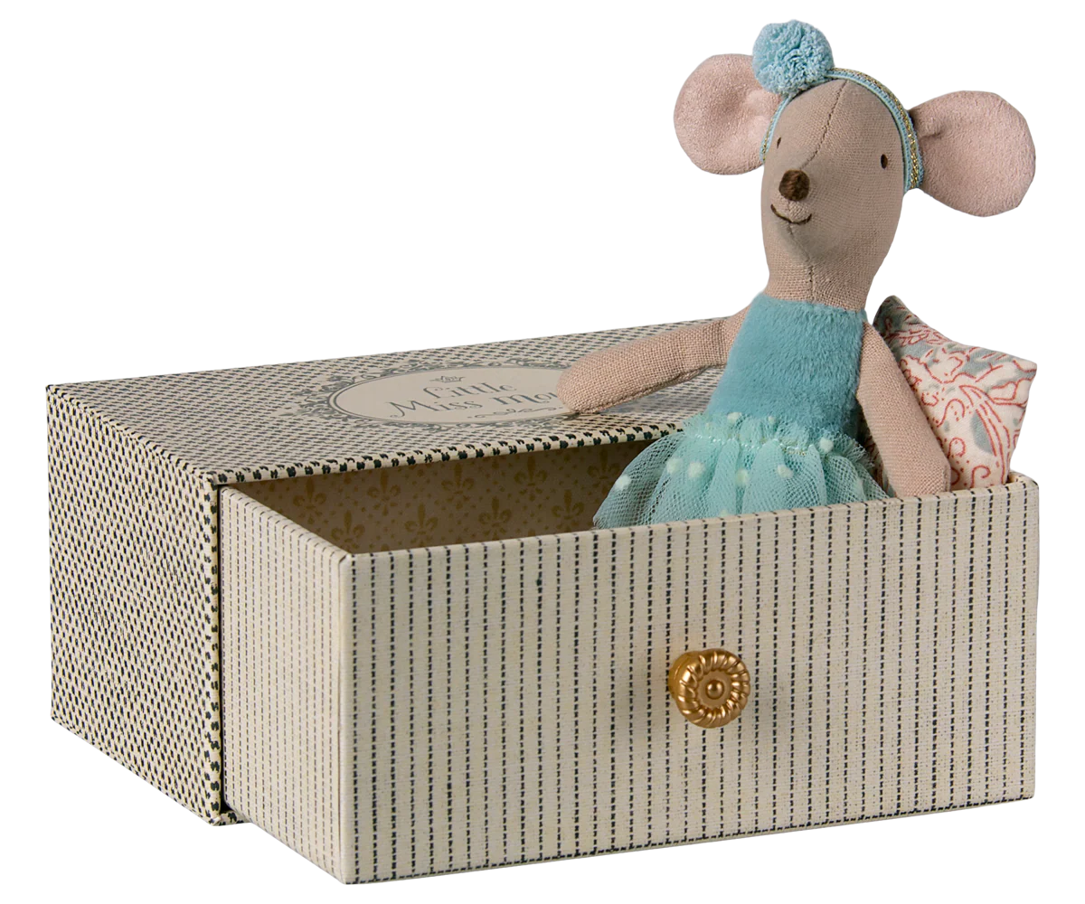 closeMyszka baletnica Maileg – młodsza siostra w pudełku-szufladzie z pościelą. Urocza maskotka do tulenia, zabawy w teatr i rozbudowy świata Maileg.
