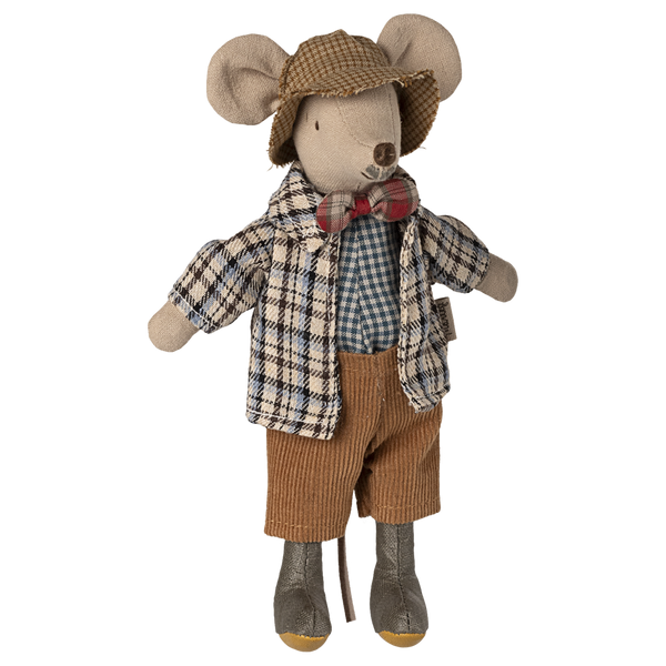 Myszka Dziadek Maileg z wąsem, w muszce, kaloszach i kapelusiku – gotowy na opowieści, wizyty u wnuków i zabawę w mysią rodzinę