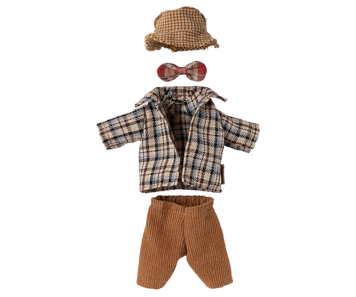 Strój Dziadka dla Taty Myszy Maileg – koszula, spodenki, muszka i kapelusik, dzięki którym Tata zamieni się w uroczego myszego seniora.