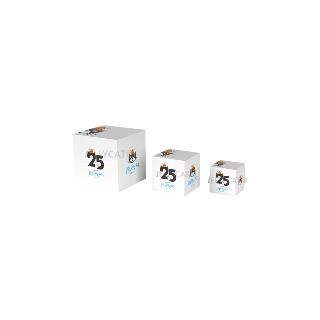 Trzy drewniane kostki wystawowe Jellycat London z motywem „25 lat” to proste, estetyczne wsparcie ekspozycji na półce lub w witrynie. Różne rozmiary ułatwiają budowanie czytelnej, warstwowej prezentacji produktów.
