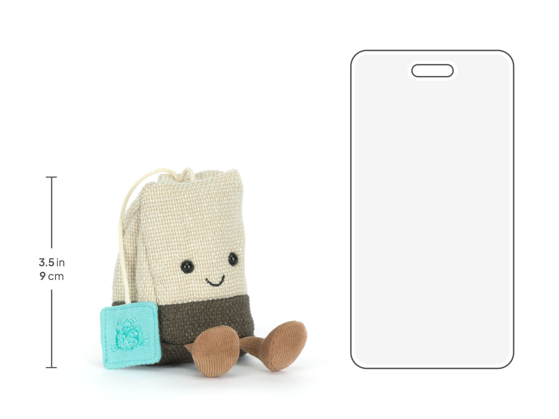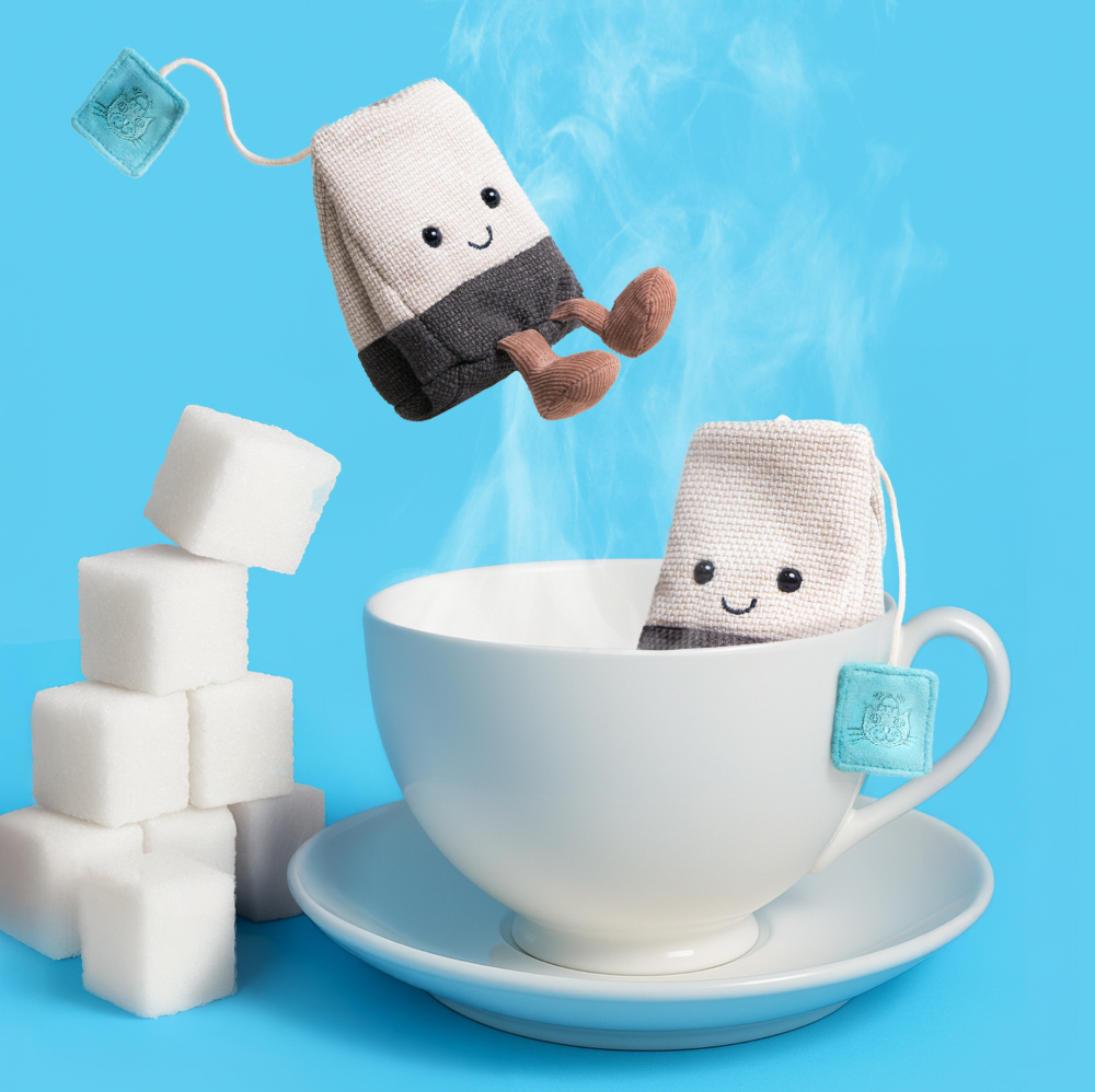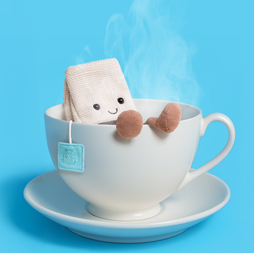 Maskotka Jellycat Steepy Tea Bag 11 cm to mała przytulanka w kształcie torebki herbaty z uśmiechniętą buźką i metką jak od naparu. To kolekcjonerski drobiazg do pokoju dziecka, na prezent i dla fanów serii Amuseables.