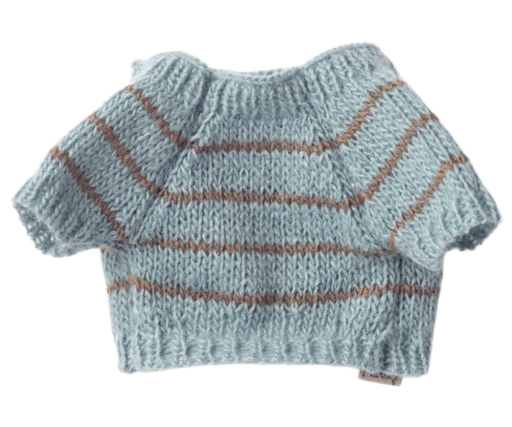 To sweterek w odcieniu przygaszonego błękitu, który dobrze pasuje do spokojnych i pastelowych aranżacji Maileg.
