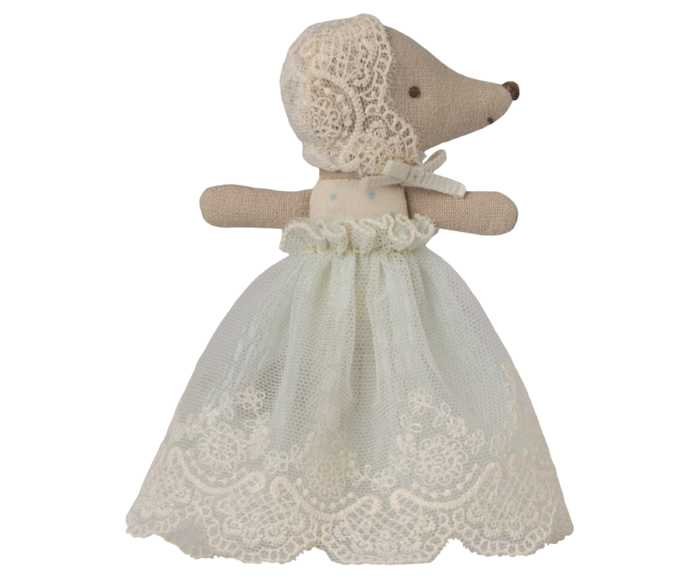 Myszka dzidziuś Maileg w miętowej sukni i koronkowym czepku to miniaturowa przytulanka na wyjątkowe chwile w świecie myszek. Delikatne kolory, dekoracyjne detale i mały rozmiar sprawiają, że pięknie uzupełnia kolekcję oraz zabawę w opowiadanie historii.