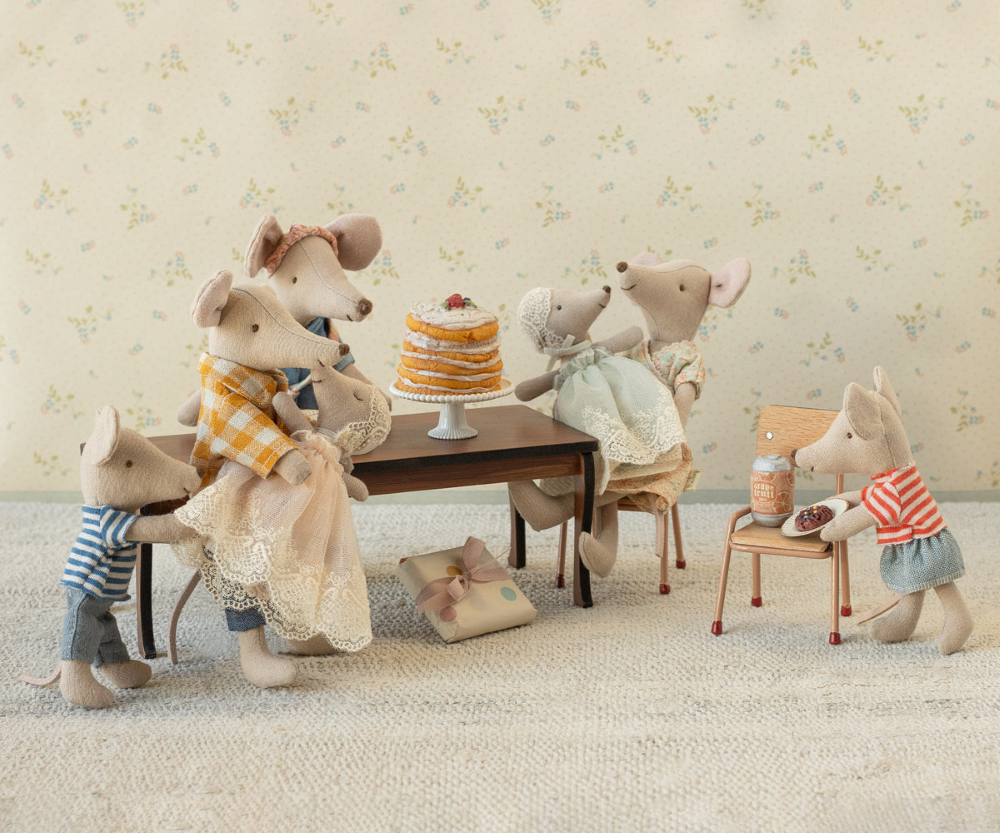 W kolekcjach Maileg to właśnie drobne szczegóły budują nastrój i sprawiają, że każda postać wydaje się częścią większej opowieści. Tutaj uwagę zwraca miętowa suknia o lekkim, uroczystym charakterze oraz koronkowy czepek, który nadaje myszce jeszcze bardziej subtelny, vintage’owy wygląd. Taki strój sprawia, że przytulanka dobrze pasuje do scen związanych ze świętowaniem, ważnym dniem, rodzinnym spotkaniem albo po prostu do tworzenia pięknie urządzonych miniaturek w domku dla myszek.
