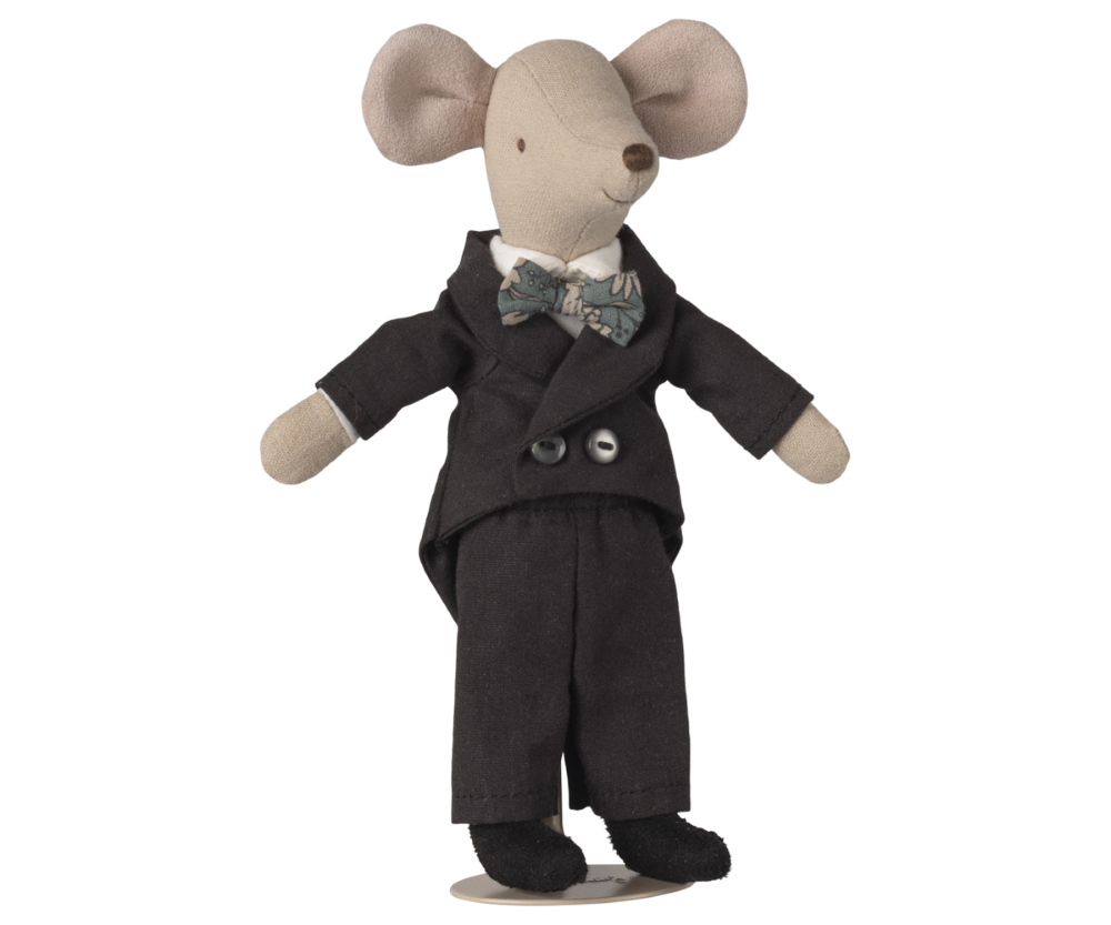 Myszka Tata ma elegancki smoking, dużą muchę i białą koszulę. Marynarkę, spodnie i muchę można zdejmować, więc postać daje więcej możliwości podczas zabawy i tworzenia różnych scen. Taki poziom dopracowania sprawia, że zestaw dobrze działa nie tylko jako dekoracja, ale też jako pełnowartościowy element świata Maileg, który można stylizować i włączać do kolejnych historii.