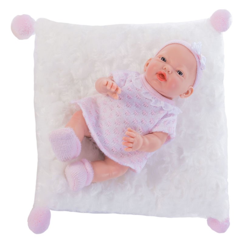 Lalka 26 cm - w ślicznym ubranku, z opaską i smoczkiem do kompletu. W zestawie również biała, kudłata poduszka z różowymi wykończeniami.