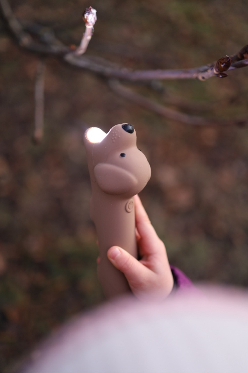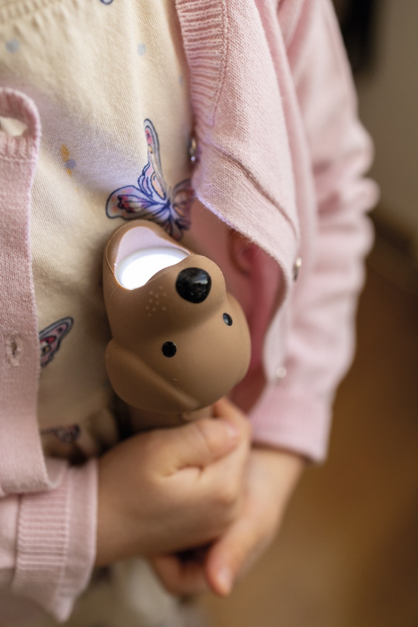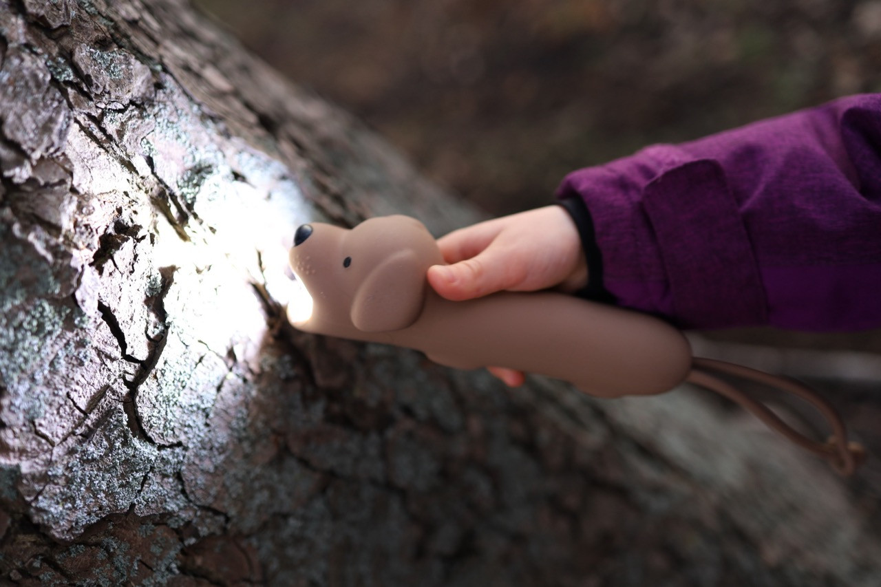 Latarka Pies BUDDY od Rabbit & Friends to urocza, przenośna lampka dla dzieci. Ma wygodny uchwyt, delikatne światło i tryb nocny. Idealna na przygody i do zasypiania!