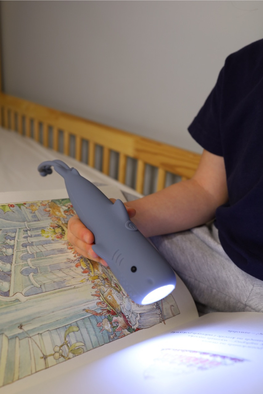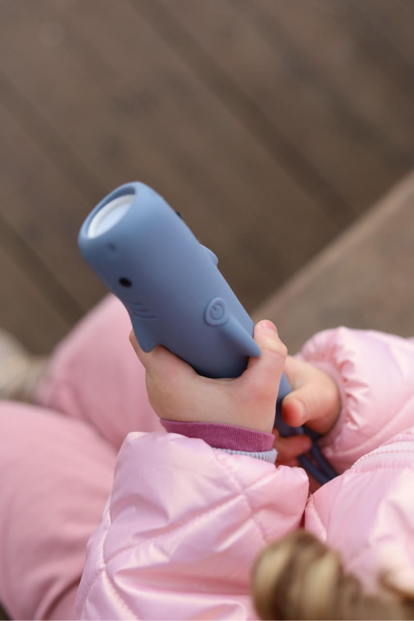 Latarka Rekin SHARKY od Rabbit & Friends to urocza, przenośna lampka dla dzieci. Ma wygodny uchwyt, delikatne światło i tryb nocny. Idealna na przygody i do zasypiania!