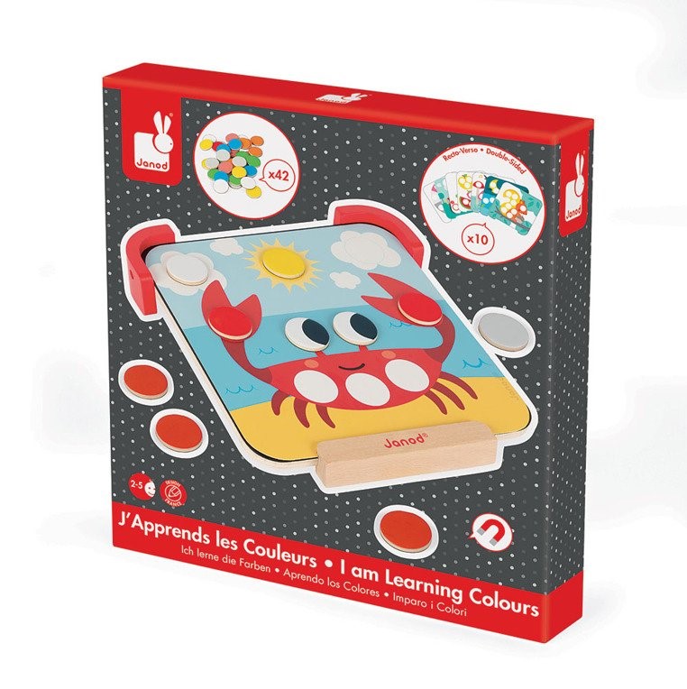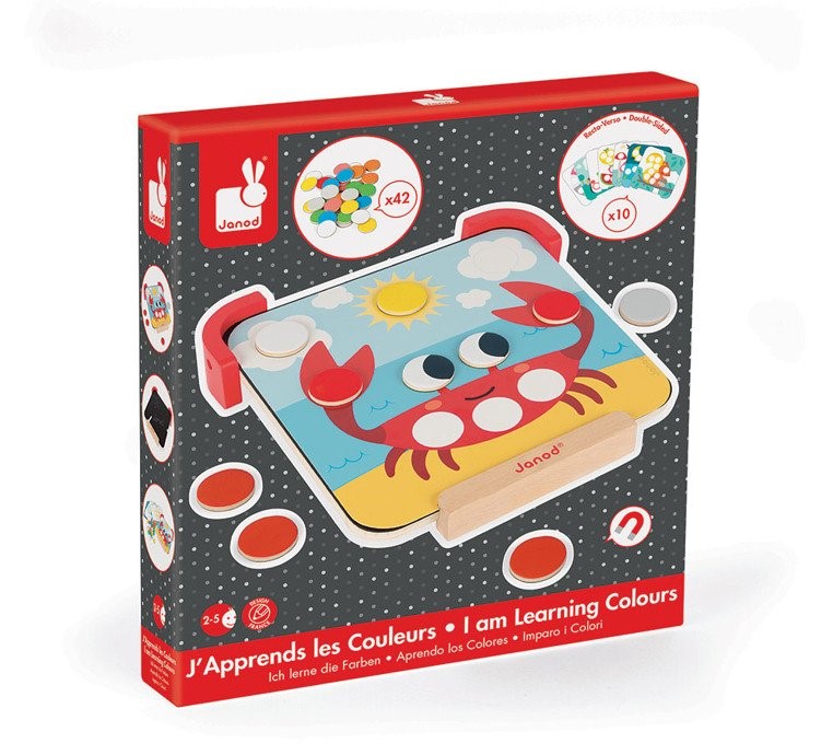 Układanka magnetyczna Uczę się kolorów francuskiej marki JANOD to idealny sposób na naukę i zabawę w jednym. W zestawie znajduje się drewniana tabliczka magnetyczna z podstawkami, 42 kolorowe magnetyczne kółka, 10 dwustronnych obrazków z zadaniami oraz kreda. Na tabliczce można pisać i rysować za pomocą kredy, a także umieszczać na niej ilustracje i wypełniać polecania, używając magnesów w odpowiednich kolorach.