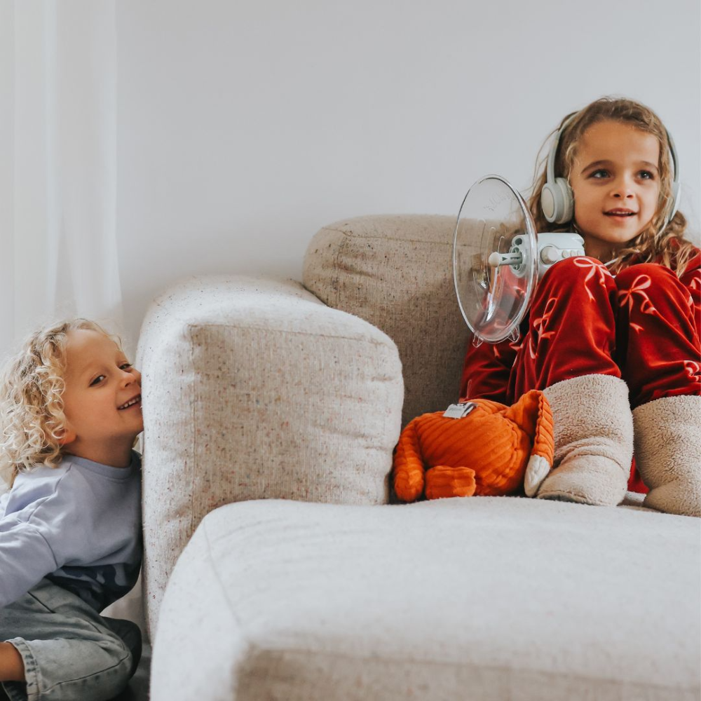 KIDYSPY to wzmacniacz dźwięku dla dzieci z mikrofonem kierunkowym i słuchawkami, który pozwala nasłuchiwać odgłosów z otoczenia, nagrywać krótkie dźwięki i bawić się w obserwację świata poza ekranem. Lekka forma, ergonomiczny uchwyt i ładowanie USB-C ułatwiają korzystanie w domu i w terenie.