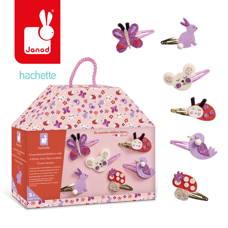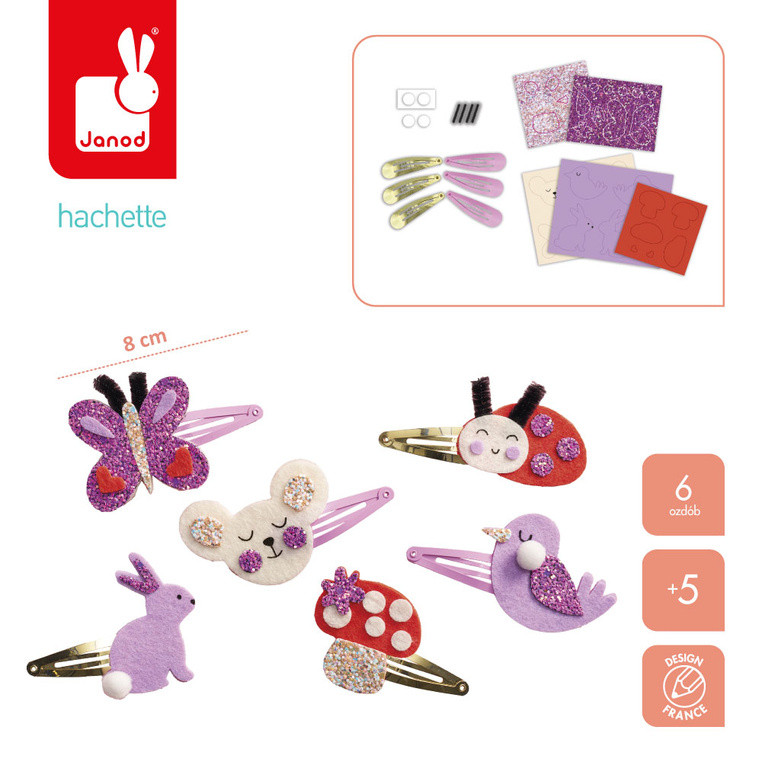 Ogród Janod to zestaw DIY do samodzielnego ozdobienia 6 spinek do włosów z motywami motylka, myszki, ptaszka, króliczka, biedronki i muchomorka. Filc, brokat i dekoracyjne dodatki zachęcają do tworzenia własnych ozdób krok po kroku.