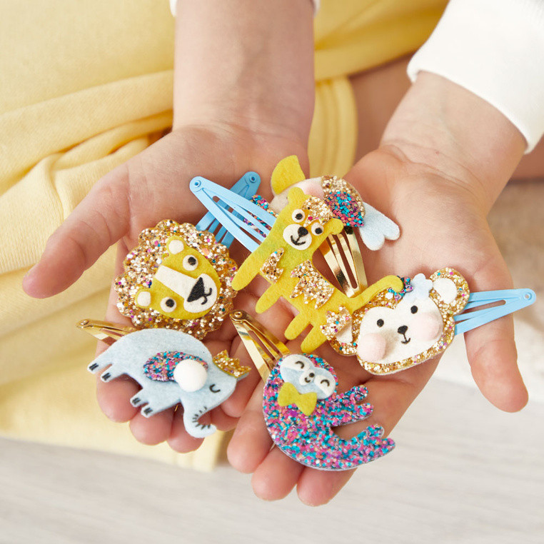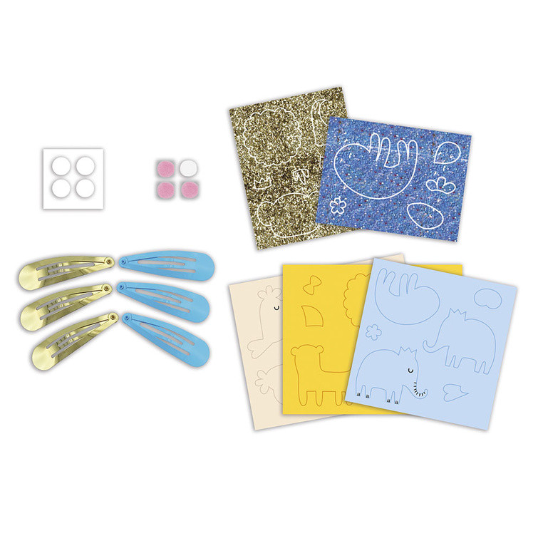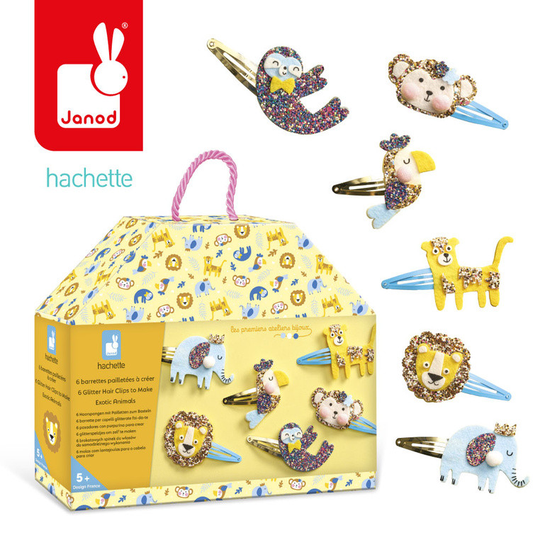 Egzotyczne Zwierzęta Janod to zestaw DIY do samodzielnego ozdobienia 6 spinek do włosów z motywami lwa, tygrysa, leniwca, tukana, małpki i słonia. Brokatowe elementy, filc i pompony zamieniają twórczą zabawę w gotowe ozdoby do noszenia lub podarowania.